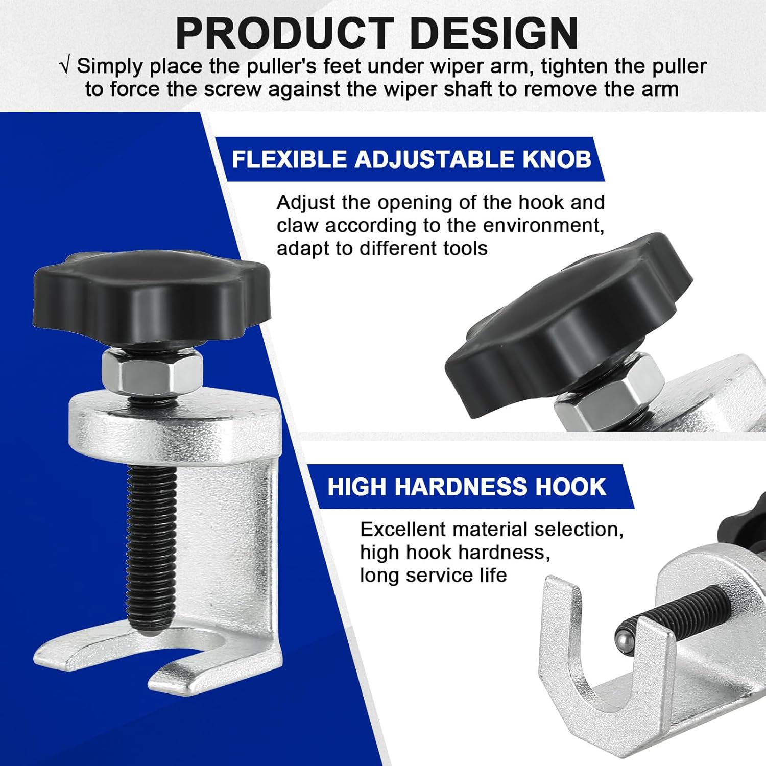 - Ideal Design: There are two wiper arm are available, one is the fixed type and the other is a bar and ball bearing with rotating mechanism for easy removal of wiper arms. The heavy duty construction of the arm battery terminal bearing remover puller kit with locking feature allows the tool to be fastened securely to the wiper arm before commencing the pull.