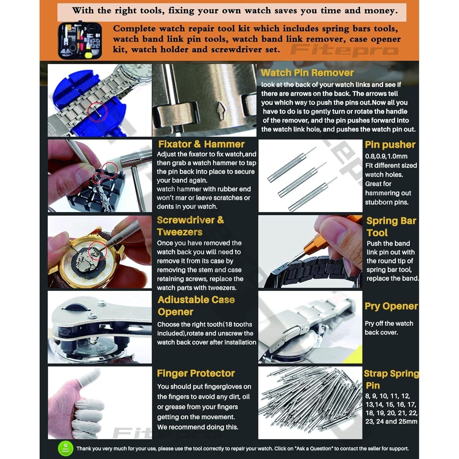 • 【Deluxe Watch Repair Kit】This complete 342pcs watch repair tool kit is made of high quality materials, includes 152 watch repair tools with carrying case, 100g(appr. 130pcs)antistatic rubber fingertips covers & 3set of batteries, suit for both professional and general use, solutions for most watch repair requirements.