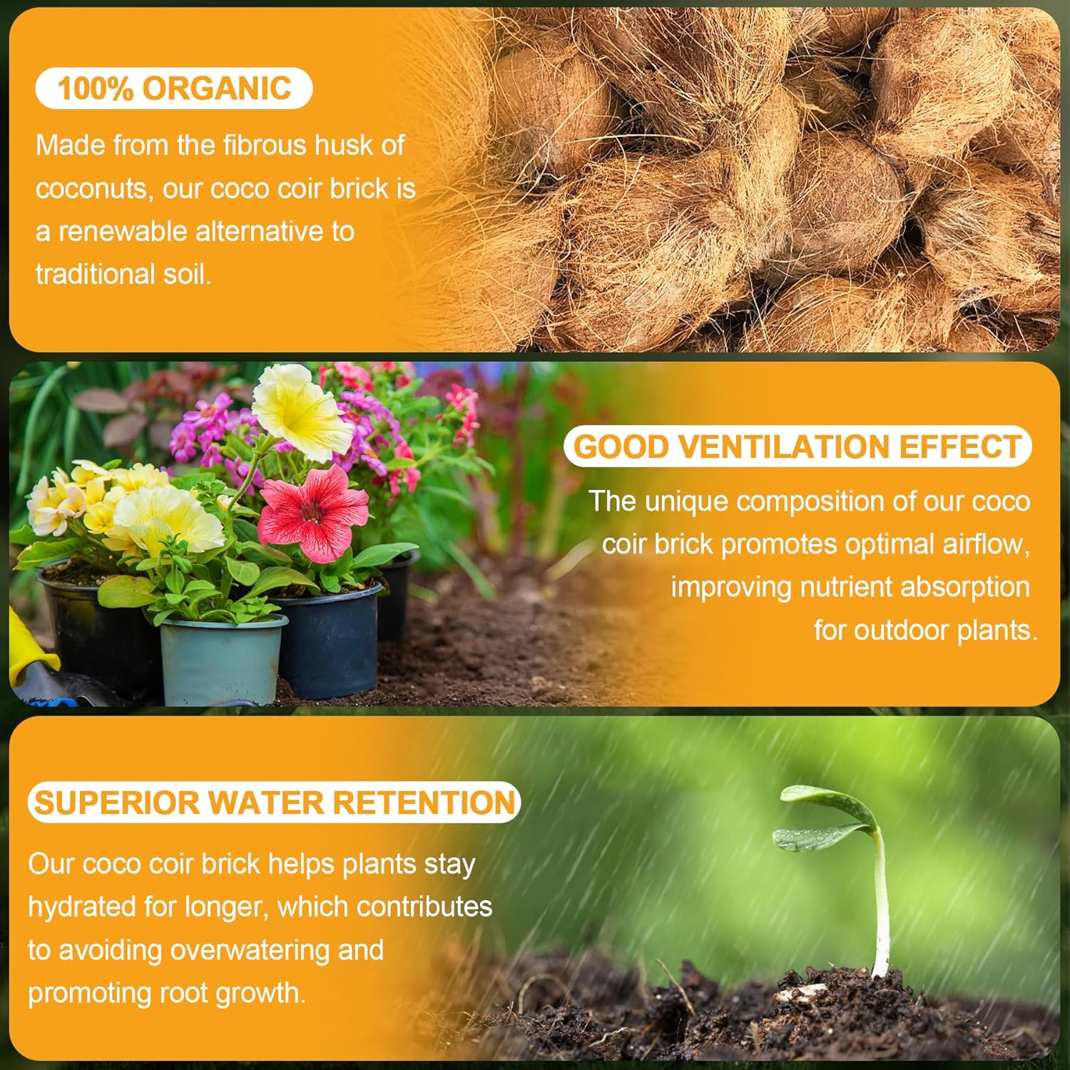 - 【Excellent Aeration】The unique composition of our coco coir brick allows for optimal airflow, creating a well-ventilated environment for your plants' roots. This promotes better nutrient absorption and decrease the risk of root rot, which means our coco coir brick is a good potting soil for outdoor plants