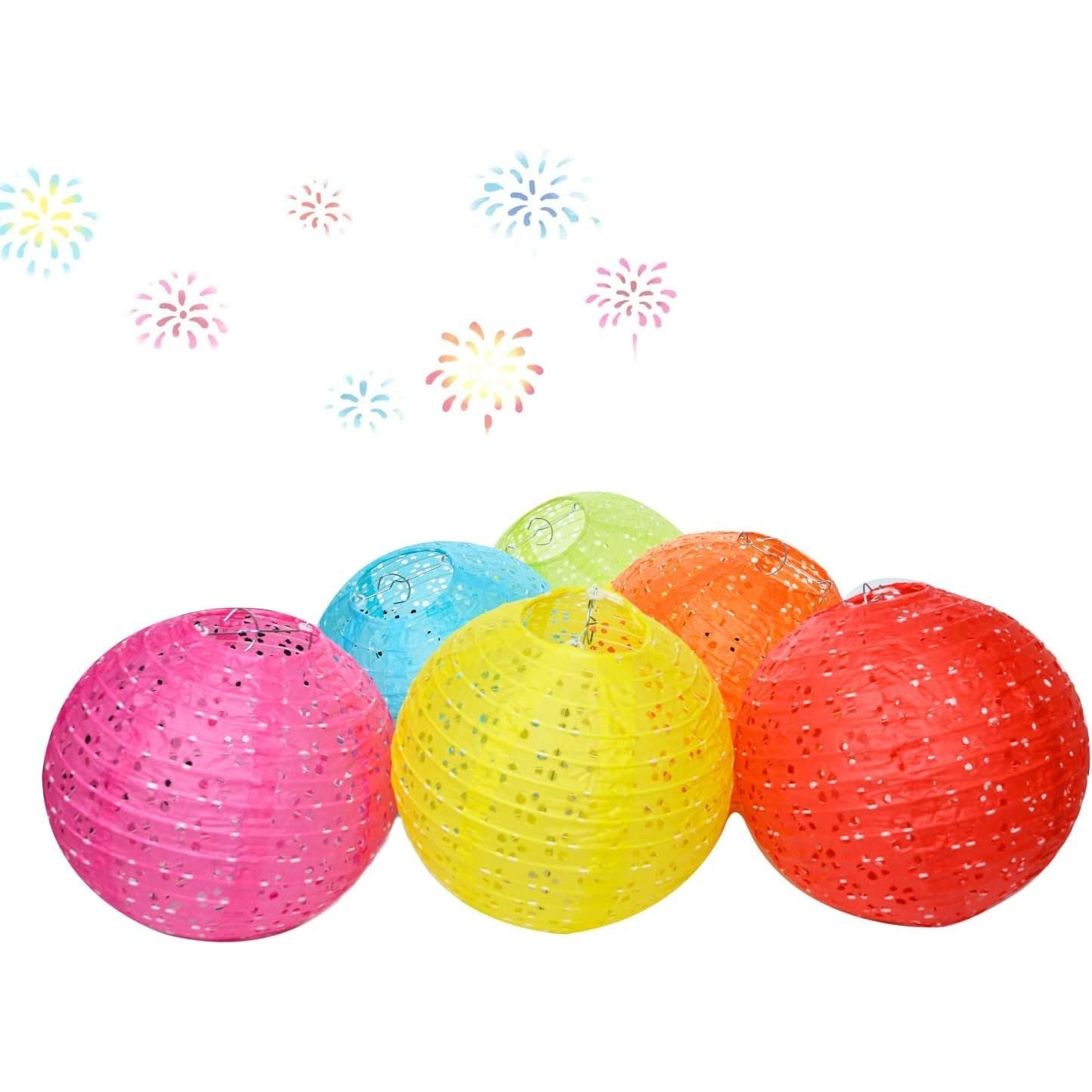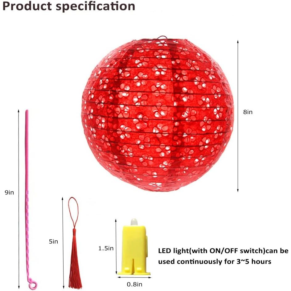 - 【WHAT YOU WILL GET】12pcs 20cm hollow out round paper lanterns (2 x Red, 2 x Blue, 2 x Green, 2 x Rose Red, 2 x Orange, 2 x Yellow, total 6 colors), 12 disposable warm white LED lights, 12 red tassels, 12 plastic lantern sticks. You can hang tassels, sticks and LED lights on the lanterns to easily create a Chinese or Japanese style festive atmosphere.