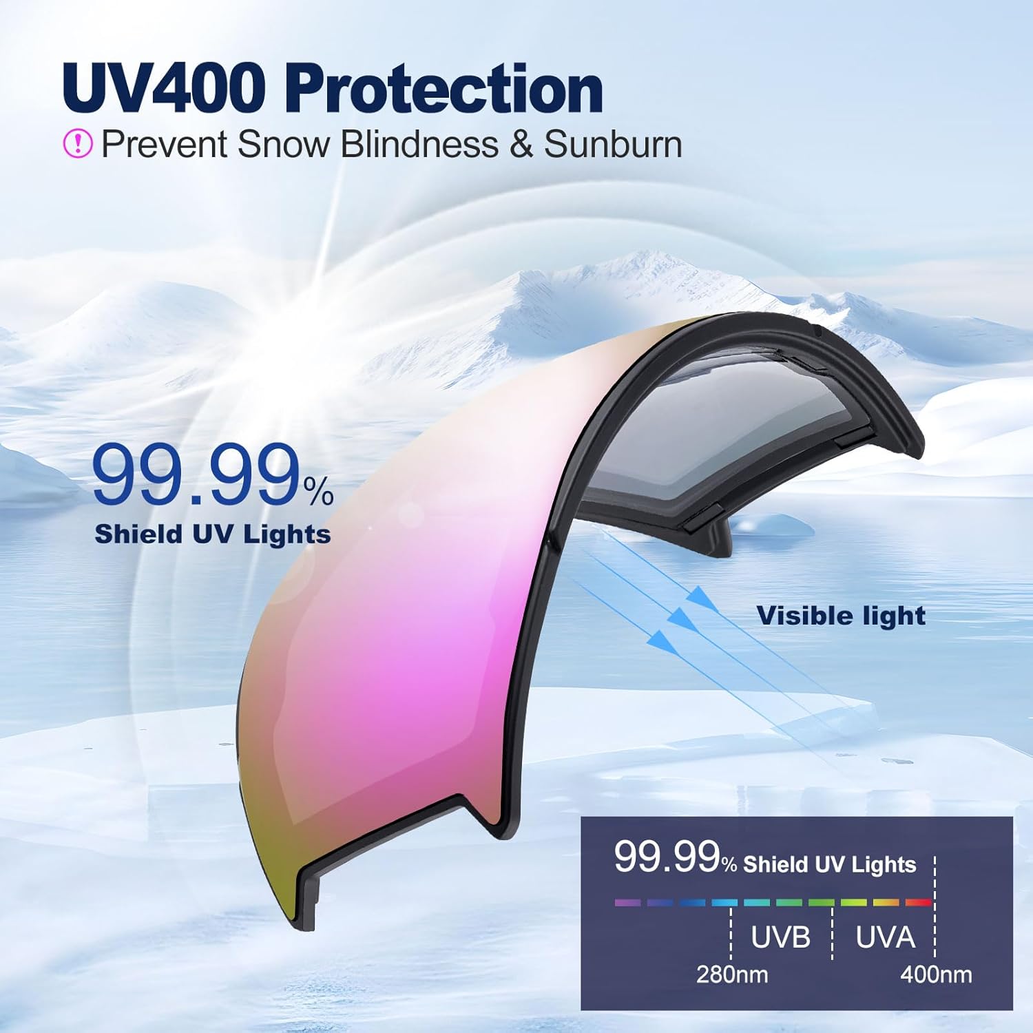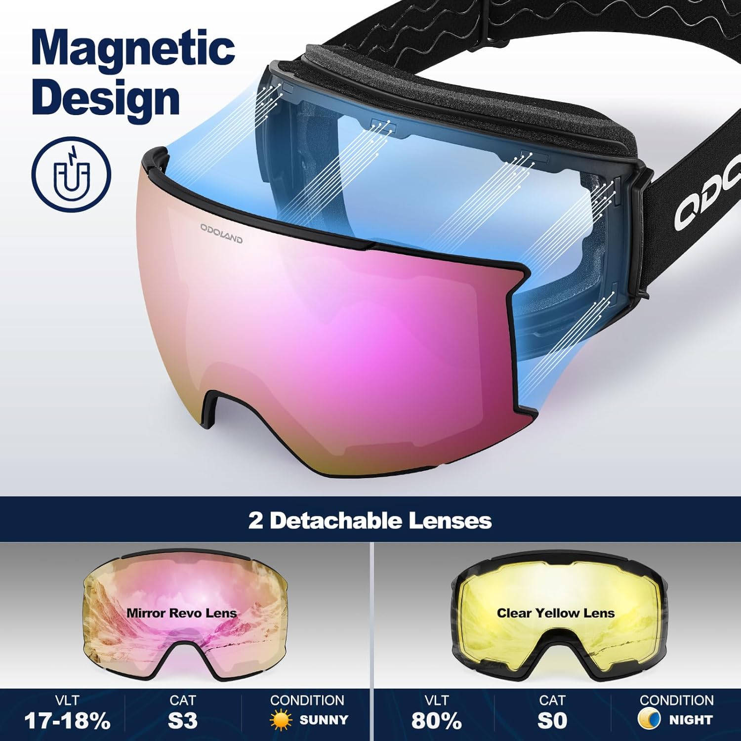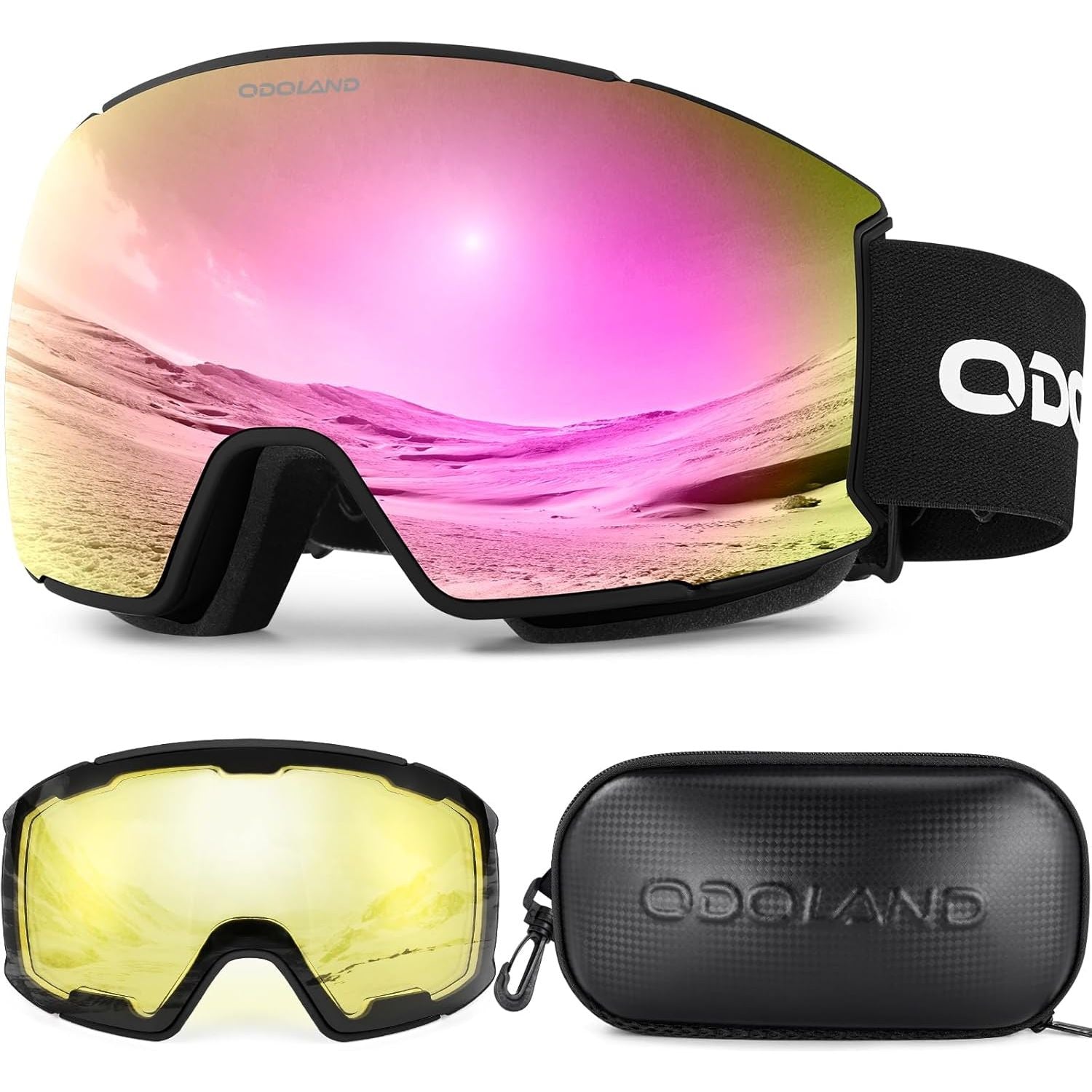 - Safety Anti-Fog System - Dual-layer lens technology with anti-fog coating inner lens, along with two-ways ventilation system, Odoland goggles give you a Fog-Free ski experience. All goggles offers UV protection. It greatly prevent scorching to eyes by the ultraviolet light or the strong sunshine reflection on the snowfield.