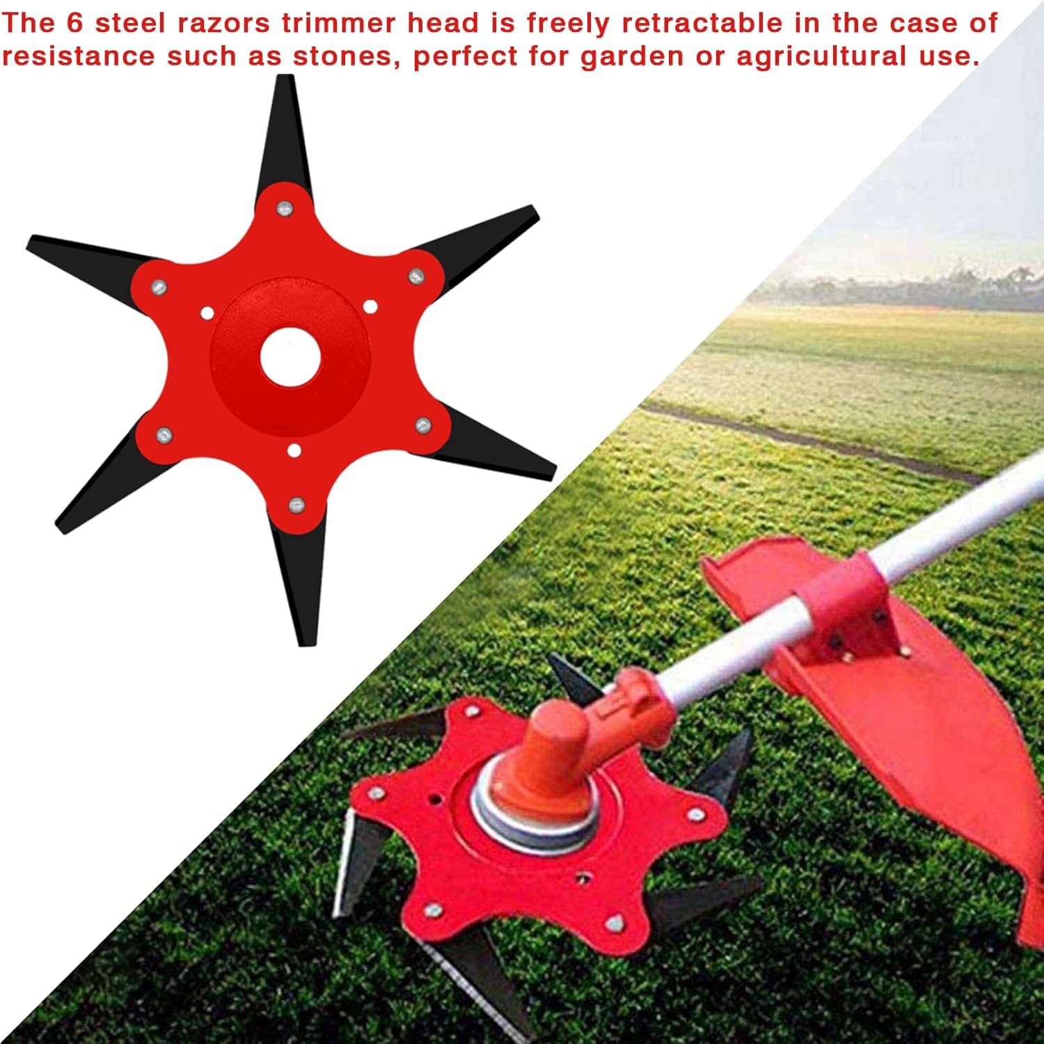 - 6 Steel Razors Trimmer Head: The trimmer head have double-sided cutting edges, when one side gets dull and blunt, just flip the blade to use the other set of edges. The blade is freely retractable in the case of resistance such as stones, perfect for garden or agricultural use.