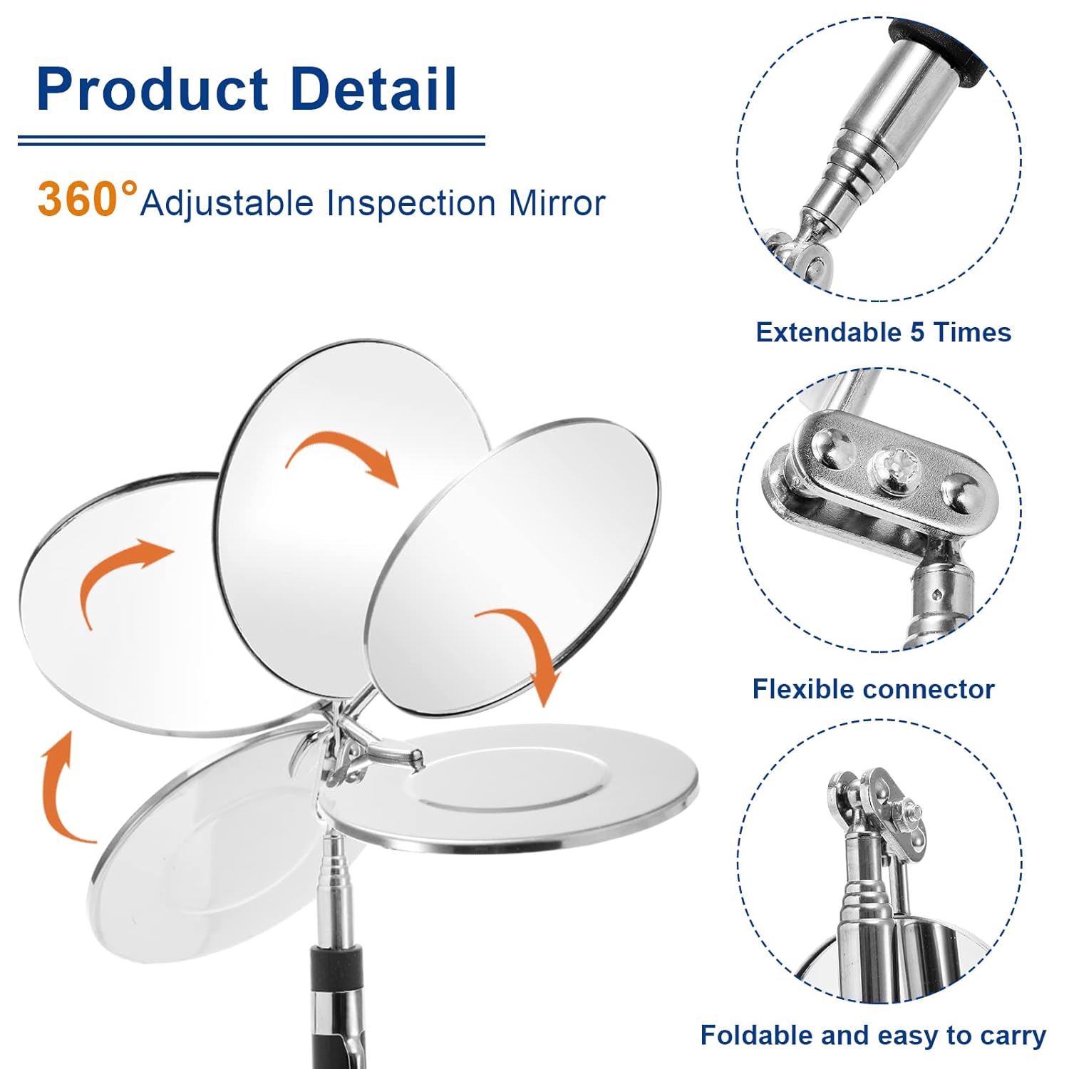 • Design: Detachable inspection mirror equips the telescoping rod, easy to extend and retract for observing hard to reach areas and the 360 degree swivel rotating mirror for optimal viewing from every angle very useful tool for your inspection needs.