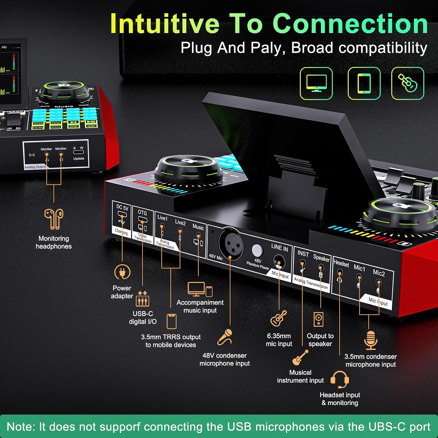 - All-in-one USB Audio Interface with Mixer: Offers one-stop solution for streamer, influencer and podcaster, to record and mix all sound sources. Flexible, intuitive and board-based mixing and controlling all of your audio with intuitive and easy-to-use onboard hardware controls, focus on your audio, audience, stream, without complex audio settings and operations, get the mixer up and running live streaming quickly.