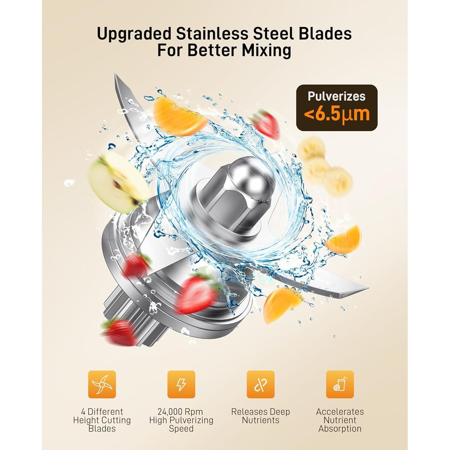 - Sharp Blade: The blade is made of one-piece 4 blades, die-cast high carbon steel with a laser cutting process on the surface, which makes the blade sharp, sturdy, wear-resistant and corrosion-resistant. It can easily crushes any food with speeds up to 38000 rpm, blend the ingredients faster and make the soup more delicate