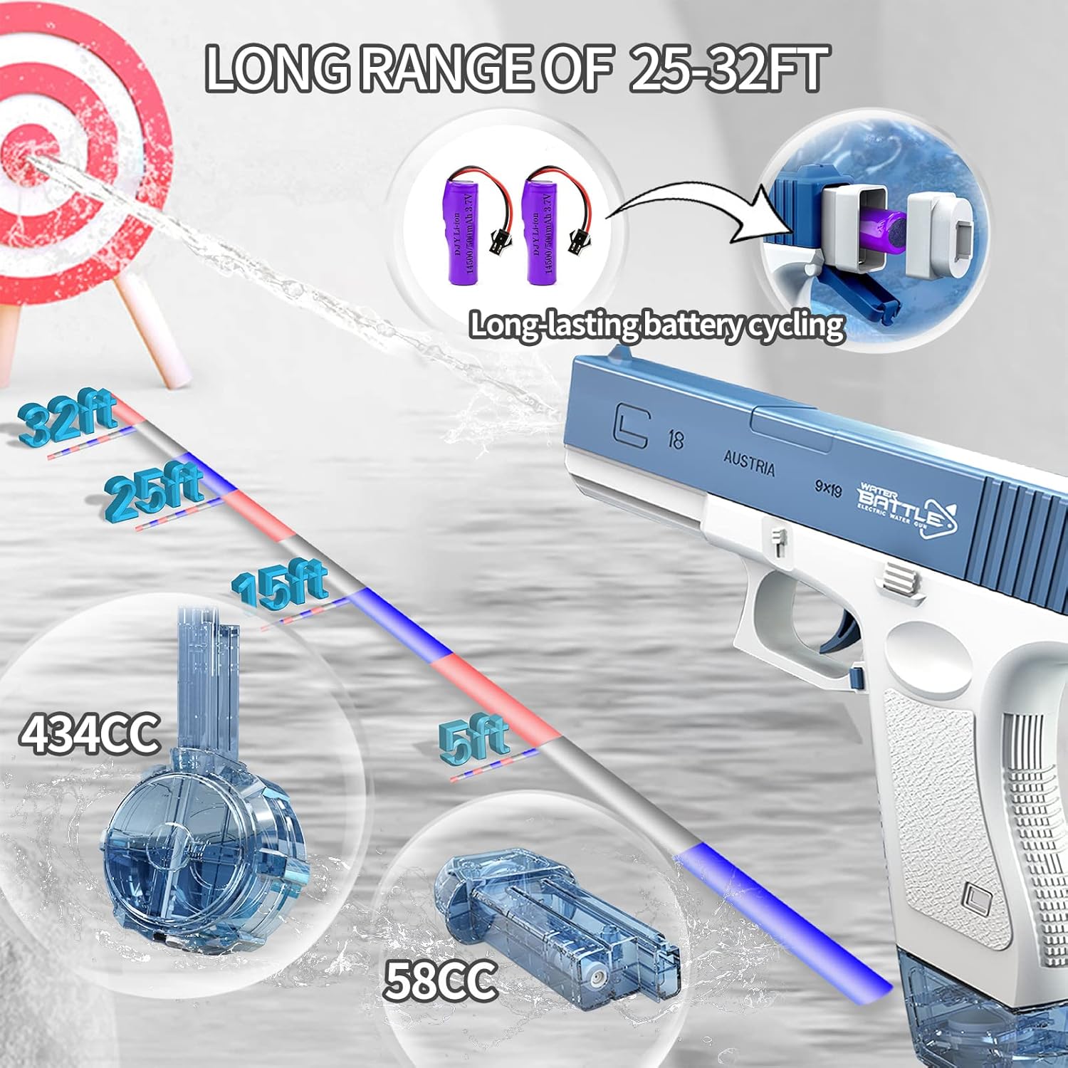 - Can be single or burst: As long as the trigger is pulled to shoot, the water can be continuously ejected from the electric water gun, and the water can be ejected again and again by pulling the trigger again and again. Range up to 10 meters. The water gun has a 434CC cylinder water magazine and a 58CC small water magazine. Full auto water pistol. Pool toys. Water gun glock.