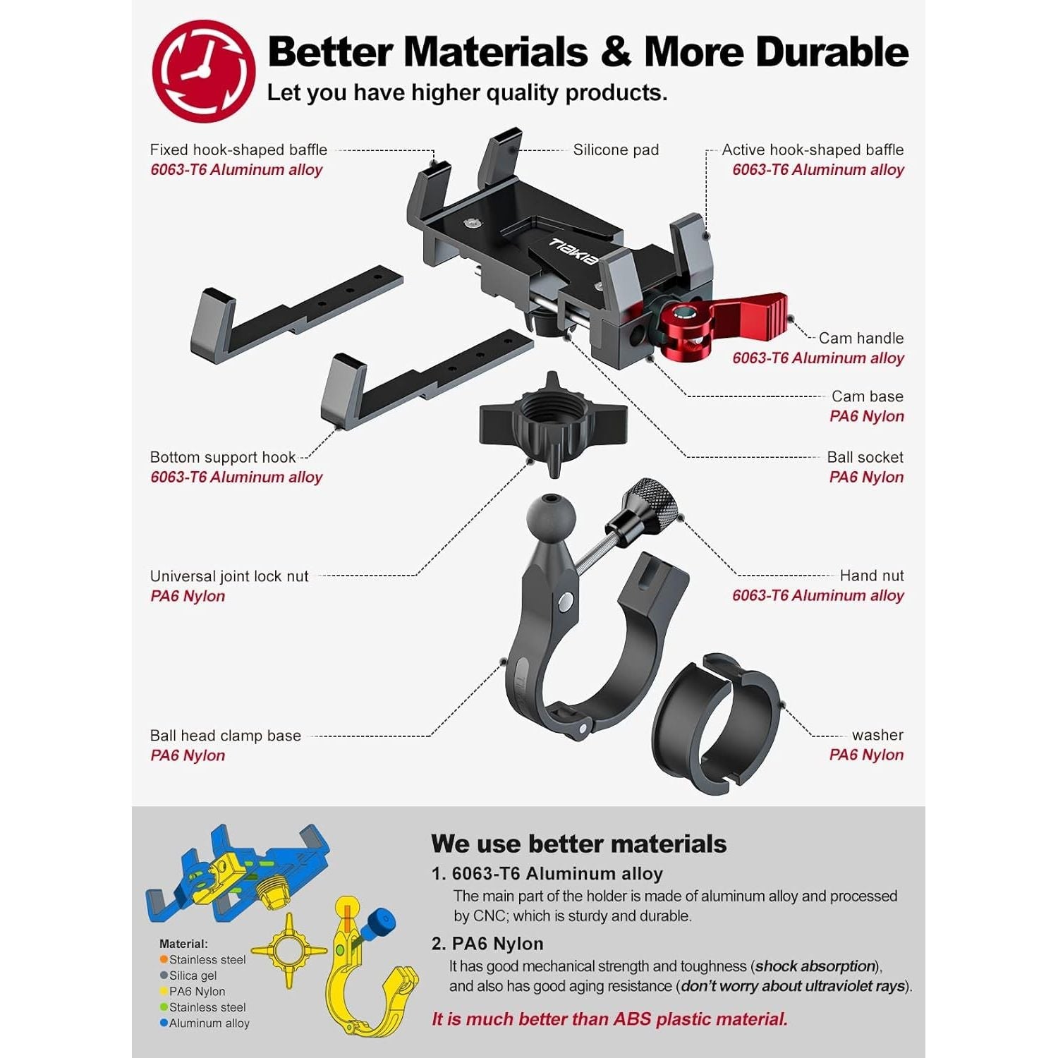 - 【High Strength Aluminum Alloy Body + Nylon Base】 The main body of this motorcycle phone mount is made of 6063-T6 high strength aluminum alloy material, which is strong and durable, CNC machining and stainless steel screw fittings. The base and spherical universal joint are made of PA66 nylon and 15% glass fiber mixed raw materials injection molded, which makes the base more resilient and can reduce vibration and impact to a certain extent. Compared to plastic and silicone phone holder mounts, it is stronger, has no vibration or noise, and will not fade.
