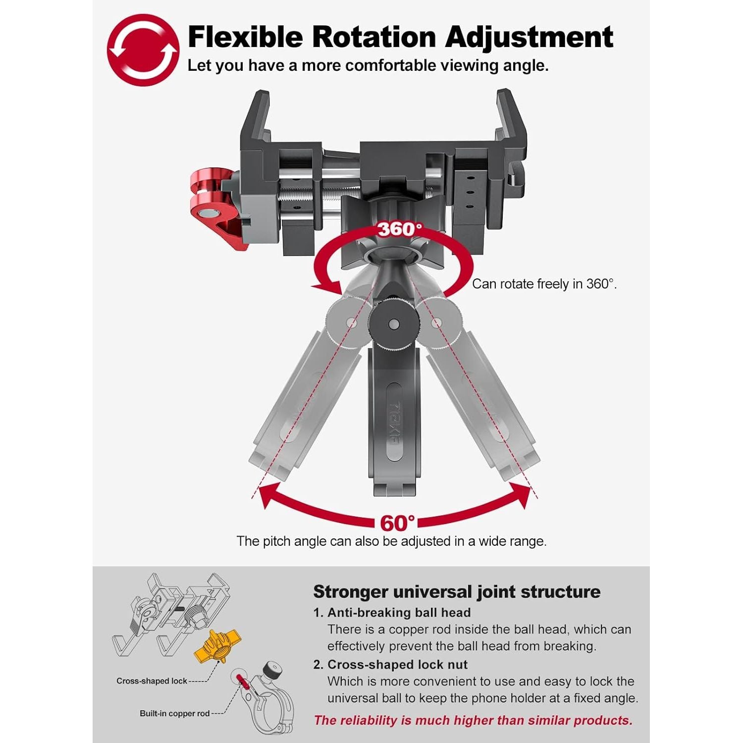- 【Lock in 1 Second,No Tools Required】 Exquisite structure, easy to use. No tools required, with a quick release button on the right side, it only takes 1 second to install or remove the phone. Compared with the traditional motorcycle phone holder, this aluminum cell phone holder saves 90% of the time. The metal swivel mechanism is firm and reliable, with spherical shape universal joint, which can rotate 360°, you can freely adjust the viewing angle.