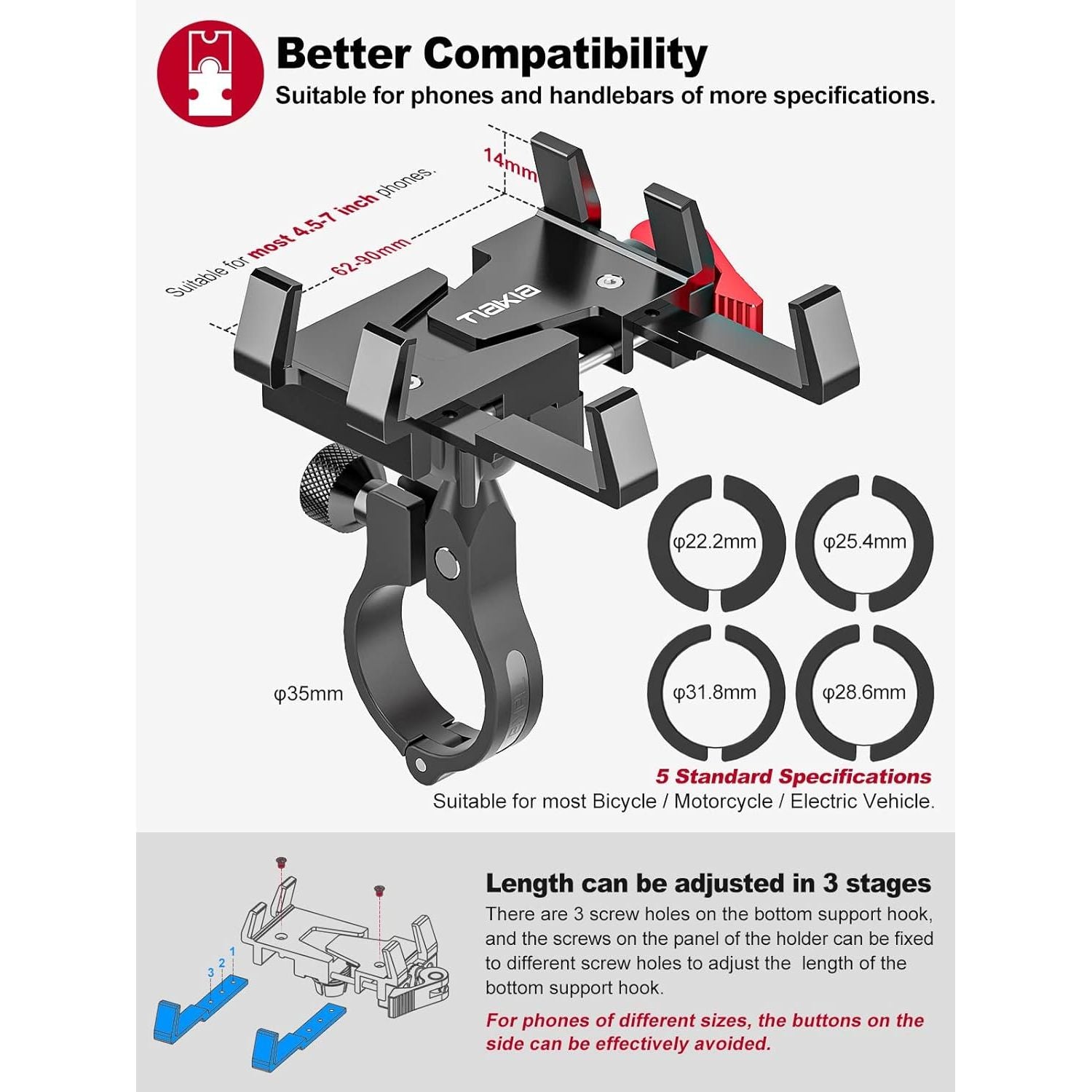 - 【Extensive Compatibility】 Universal bicycle phone holder, suitable for 4.5-7 inch smartphones, suitable for phones with a width of 62-90mm and a thickness of <14mm. Comes with a rubber pad, which can be adjusted to correspond to different handlebar sizes, suitable for bicycles/mountain bikes/road bikes/downhill bikes/motorcycles/electric bikes with a handlebar diameter of 22.2-35mm.