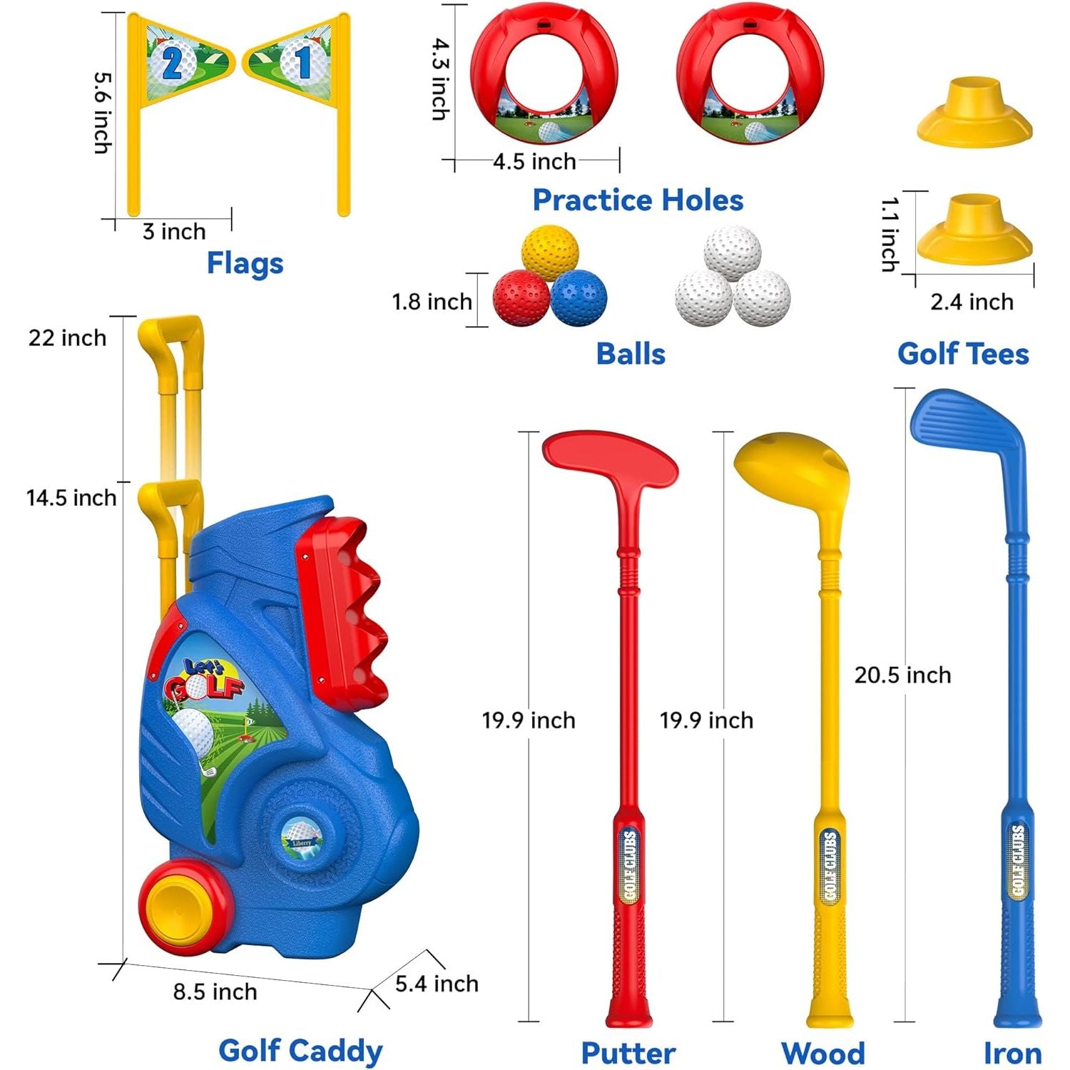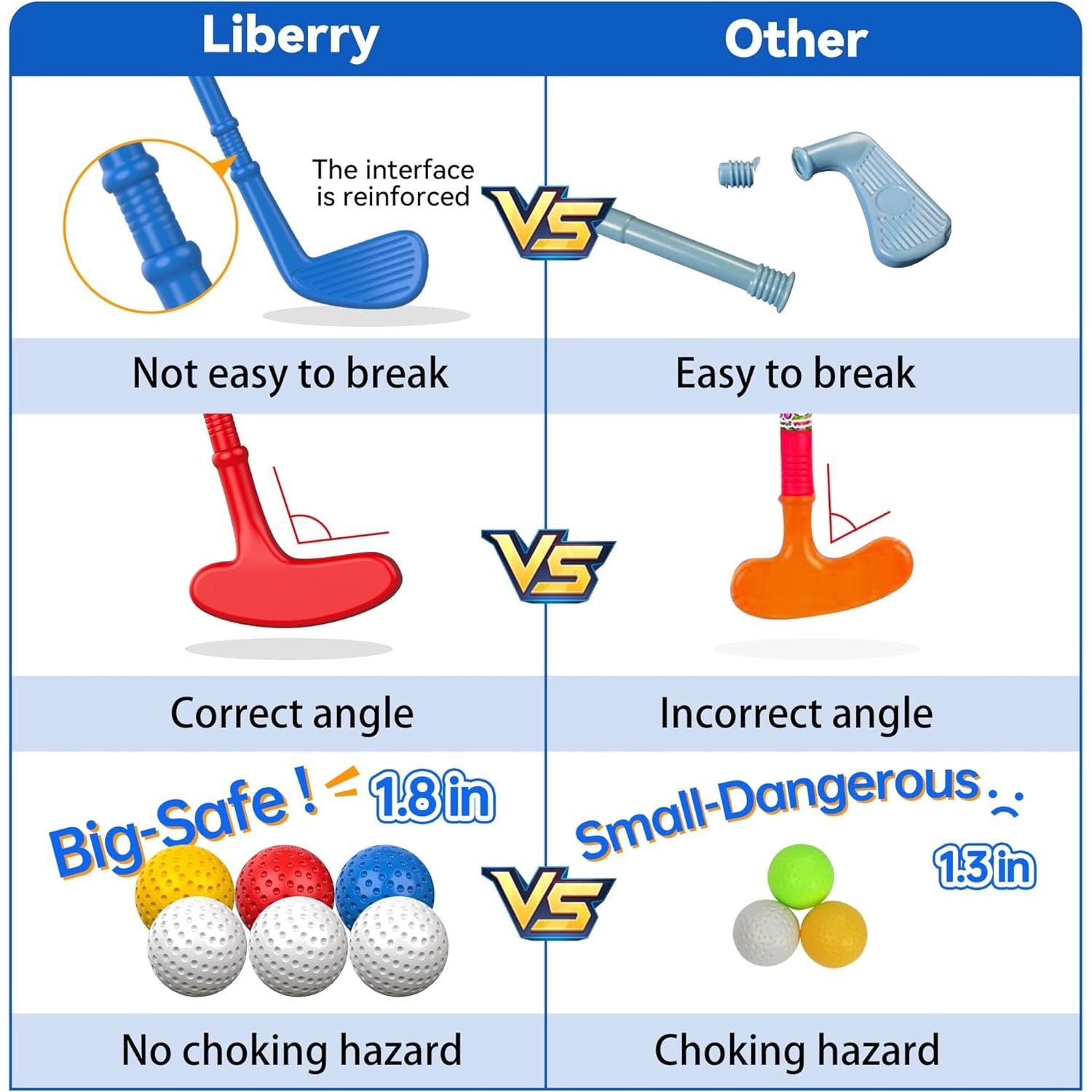 • Safe and Durable: The latest version of Liberry's kids' golf set is produced with odorless and high-quality plastic. The toddler golf set does not include any parts or edges that are jagged or pointed. The hardness of the club is enhanced, and it is not easy to break. Because our golf balls are larger (1.8 inches in diameter), it can effectively avoid choking hazards