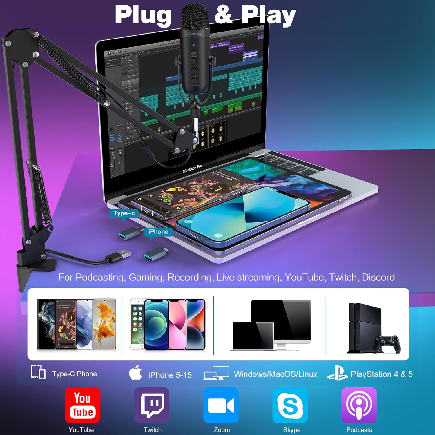 - 【Plug and Play】With its plug-and-play design, this USB Recording Microphone is compatible with a wide range of devices, including a USB cable for MacBook, PS4/5, Windows Mac OS PC Computer Laptop, iPad, Tablet; a dapter for iPhone and Apple devices; a Type C adapter for Type C devices and Android smartphones. No drivers are required, so you can start recording with this condenser microphone right out of the box.(NOT compatible with Xbox.)