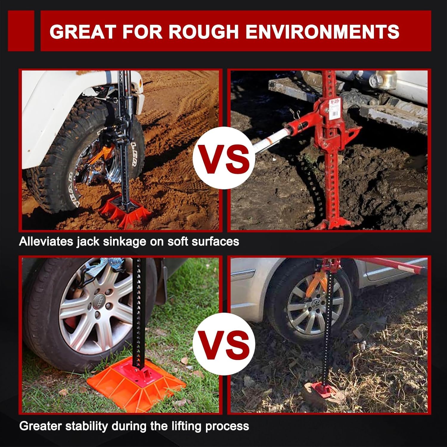 - Alleviates Jack Sinkage on Soft Surfaces: The jack base is designed to alleviate jack sinkage on soft surfaces,like sand, mud, grass. Provide the off-road base with better footing and greater stability during the lifting process