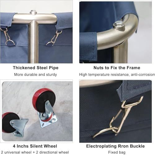 - [Waterproof and Anti-rust]-laundry cart with wheels Equipped with a removable stainless steel frame and waterproof Oxford cloth lining, wear-resistant, easy to store, 10 metal hooks to prevent the lining from moving.Easy to assemble