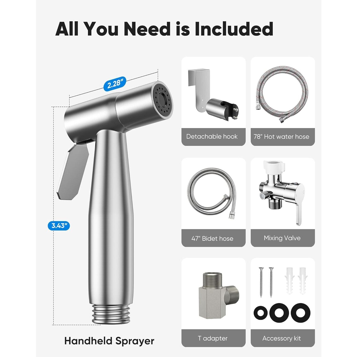 • Premium Quality: The muslim shower kit consists of a 304 stainless steel bidet head and hose, a brass material mixing valve to ensure durability. All components of the bidets for toilets are crafted from premium material, featuring a superior brushed finish that is rust-proof, anti-corrosion, and leak-prood for easy maintenance and reliable performance.