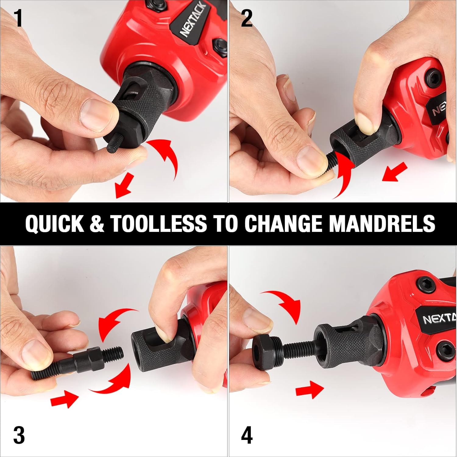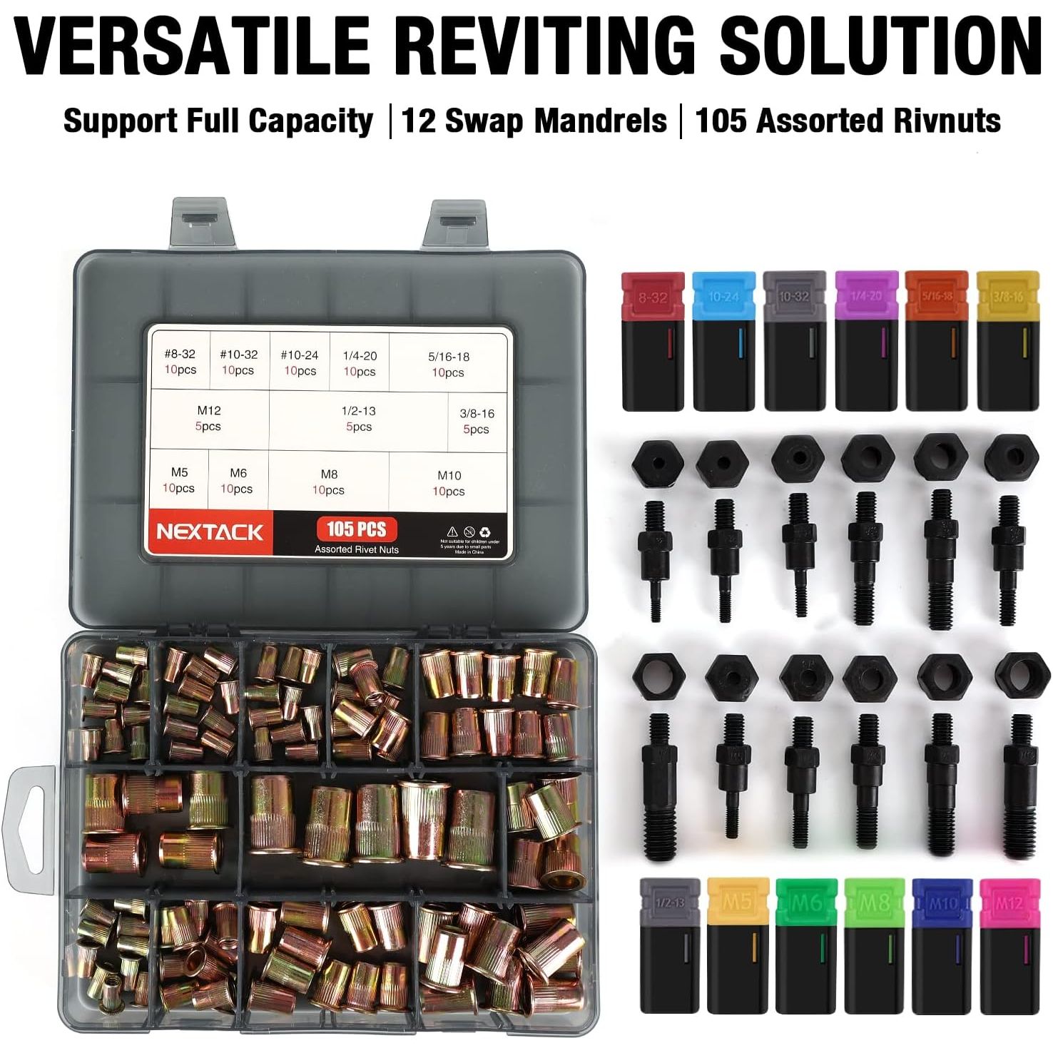 - 【Compact Organized Storage】The rivet nut tool rivet nut kit includes: 1*Rivet Gun, 105*Rivnut Kit(Stored in a labeled box), 12* Interchangeable Mandrels 8-32 10-24 10-32 1/4-20 5/16-18 3/8-16 1/2-13 M5 M6 M8 M10 M12, 1*User Manual,1*Wrench, all packed in a heavy-duty blow-molded portable case.