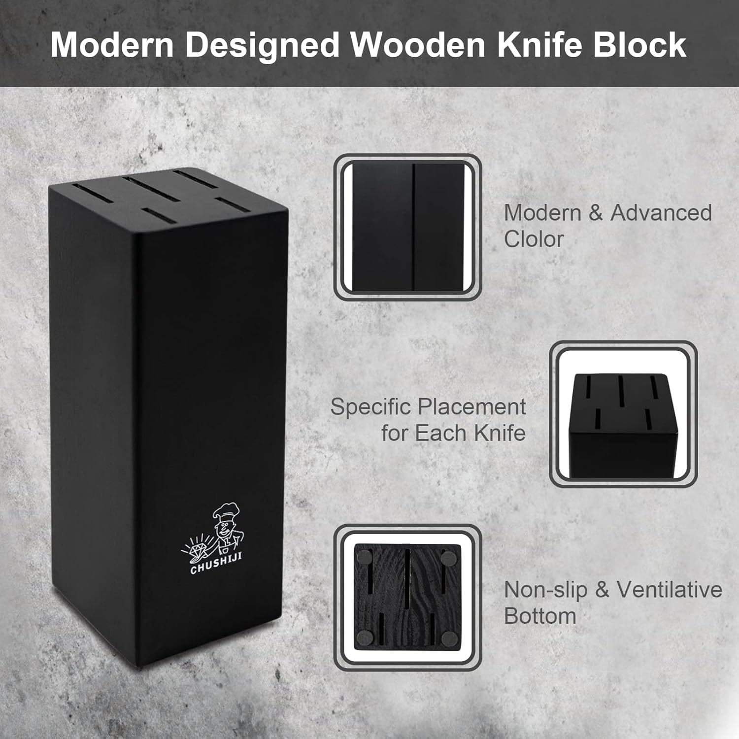 • MODERN DESIGNED WOODEN KNIFE BLOCK:Made of natural rubber wood, CHUSHIJI's block with knife set features more solid block, specific position for each knife and a non-slip breathable bottom.the block features deep slots designed to safeguard the sharp blades, ensuring both protection and secure storage.