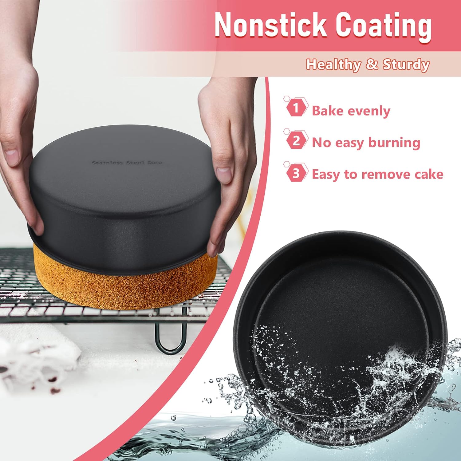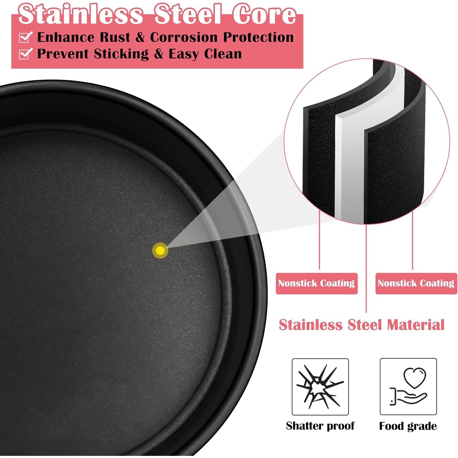 - HEALTHY STAINLESS STEEL CORE: made of food grade stainless steel core instead of ordinary aluminum/metal core, better rust and corrosion protection, no worry about toxic substances being released to your cakes in the heat, healthier alternative to aluminum/metal cake pan
