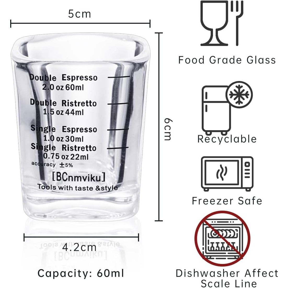 - BCNMVIKU ESPRESSO SHOT GLASS DIMENSIONS --- 4.5cm x 4.5cm x 6.5cm (1.8 x 1.8 x 2.6 inch) - content 60ml ( 2oz) - measuring accuracy: +/- 5% 2 ounces (2oz/60ml) and features a tasteful and elegant square design | hand-wash recommended to preserve imprint