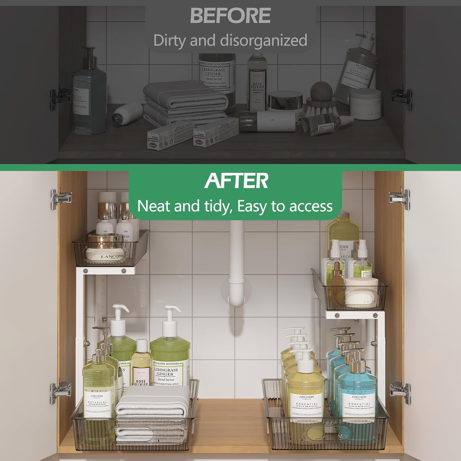 • 【L-shaped Design】: The 2 tier sliding under sink storage is designed to be L-shaped, features a narrow top basket and one slide-out wide storage drawer which makes it easier to find things in a tight space and add more storage space to your bathroom kitchen under sink, countertop or the pantry