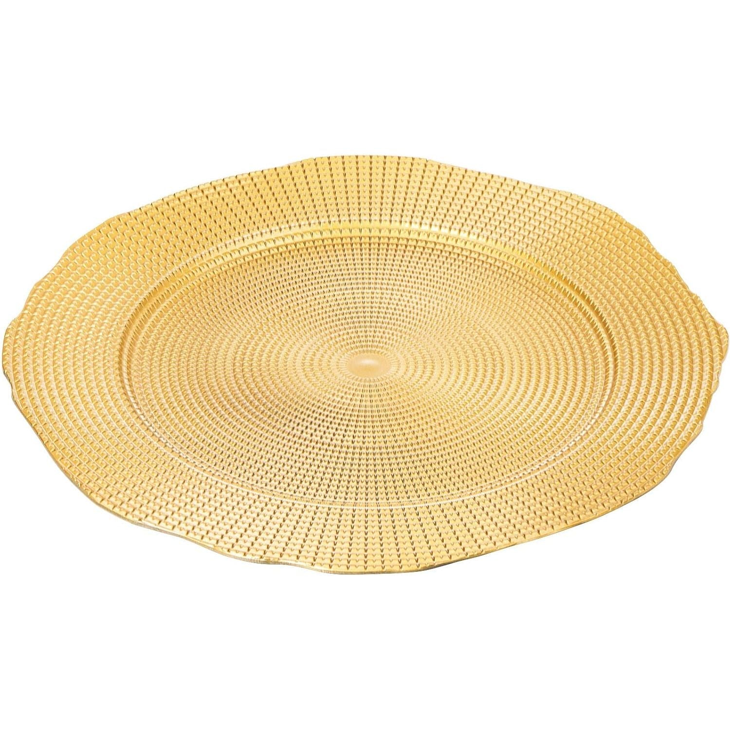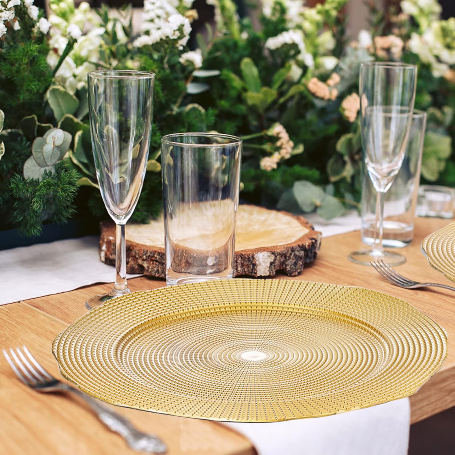 • The surface of plastic charger plates is carved with geometric texture and full of the aesthetics, each gold serve plate is designed with irregular ruffles edge and overall is classic round shape, have high end looking, which is inexpensive way of elevating the class of any dinner table!
