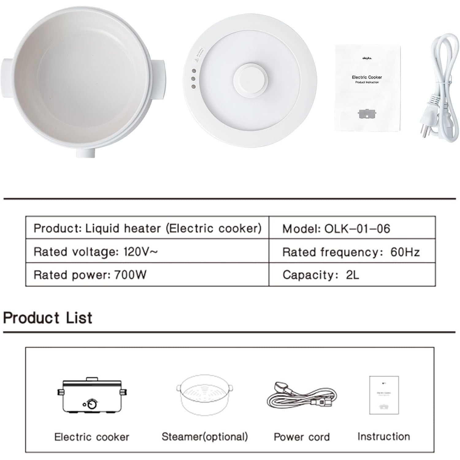 Olayks Electric Steamer for Cooking, 2L Ceramic Glaze Non-stick Pot, Dual Power Multi-functional Electric Cooker, Suitable for Steak, Pasta, Hot Pot, Ramen, Quick Heating and Overheat Protection
