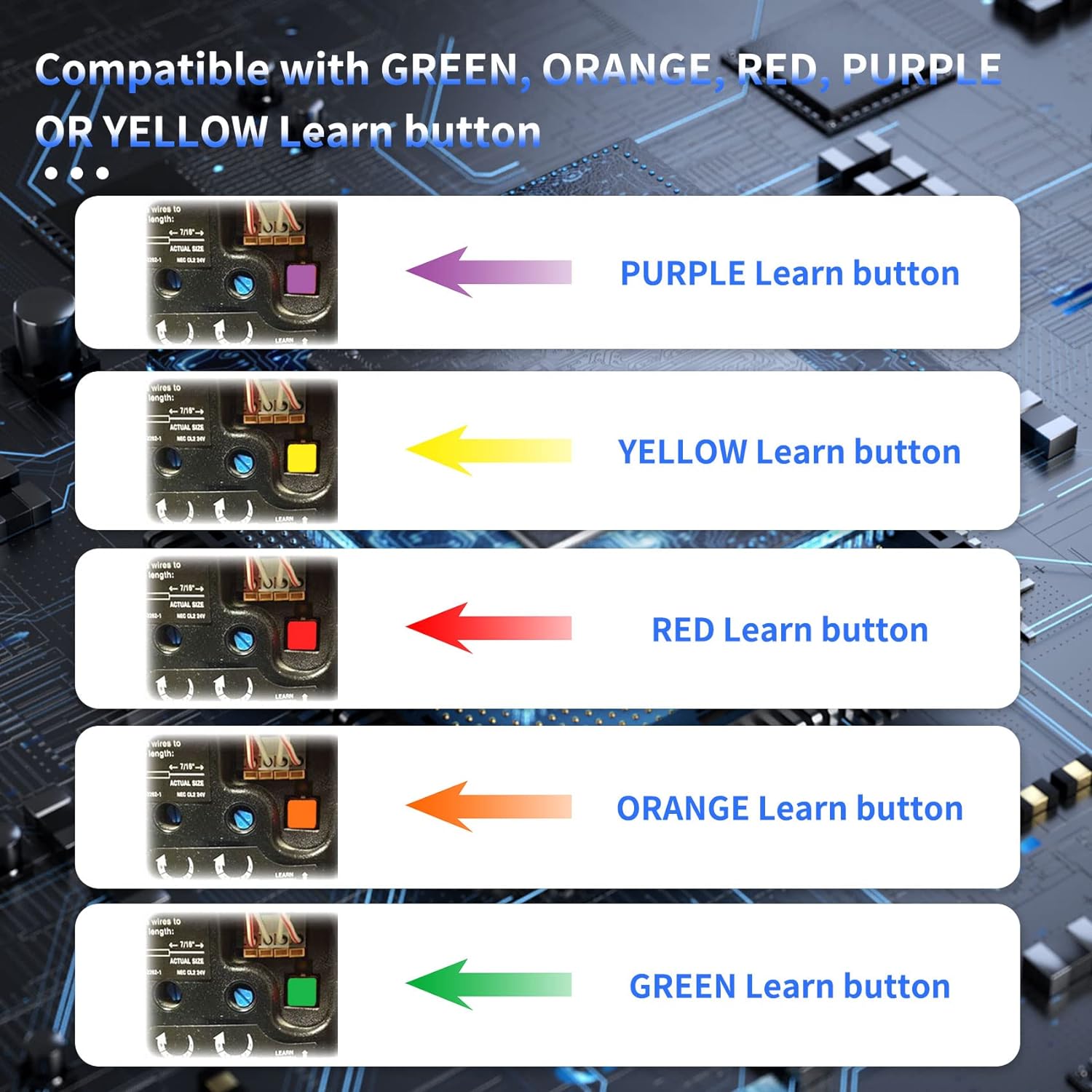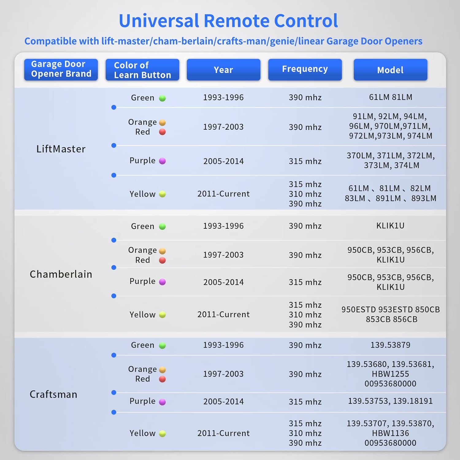 - Universal Compatibility: for LiftMaster/Chamberlain/Craftsman garage door opener manufactured from 1993 to current, compatible with universal garage door opener including Yellow/Purple/ Red/Orange/Green Learn Button. Please refer to the model list on the A+page for the applicable models.