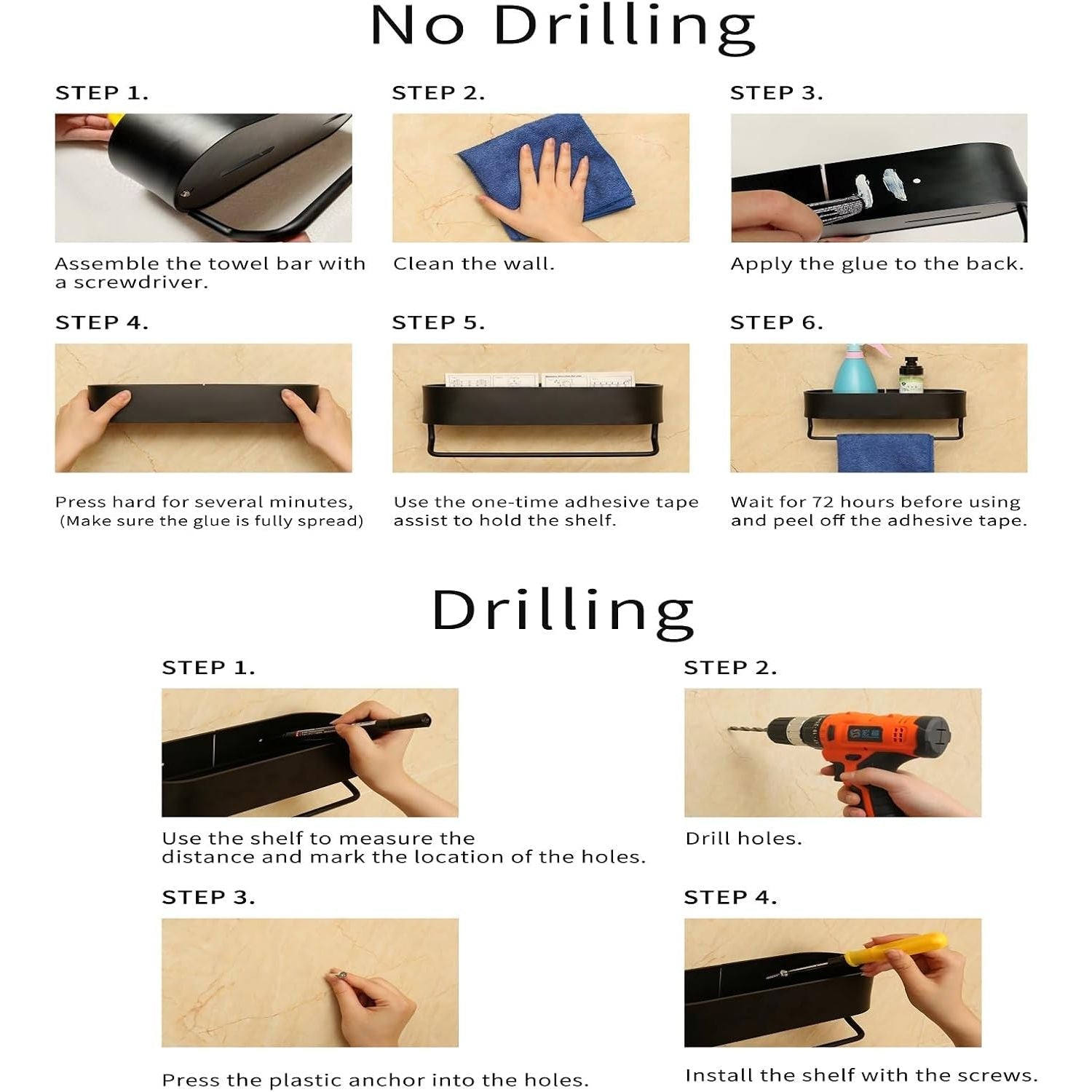 • Two installation methods: For the bathroom shelf, we provide self-adhesive options that require no drilling; we also include screw fittings for drilled installation. Depending on the type of wall, you can choose the installation method that best protects your wall from damage.