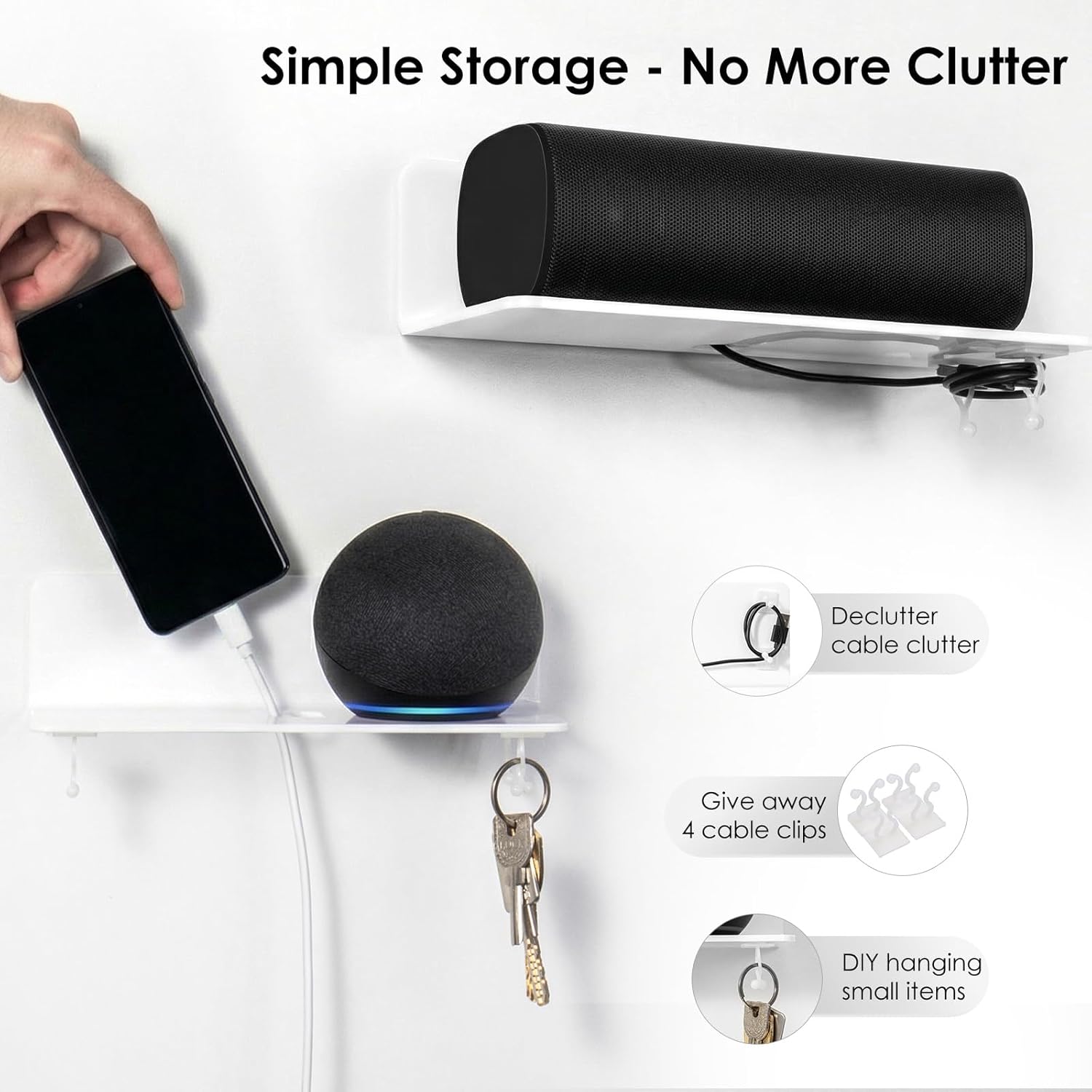 - EASY INSTALLATION: Floating shelf installation is simple, no damage and no holes in your walls, Each floating shelves has 2 cable clips and 5 x Double-sided tapes.