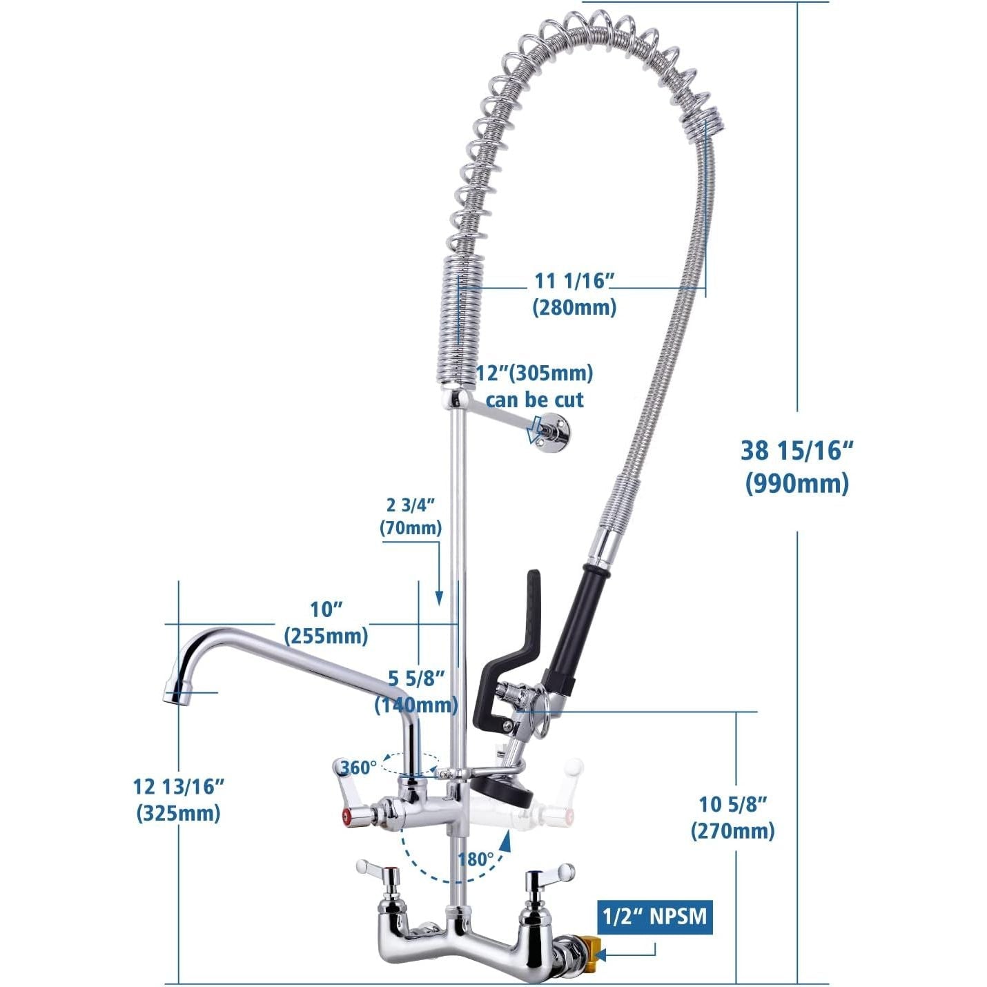 • 【10” Swivel Spout】Commercial Pre rinse faucet with 10 Inch add on faucet ,fit for 1,2 ,3 compartment sink use at home or restaurant industrial kitchens.