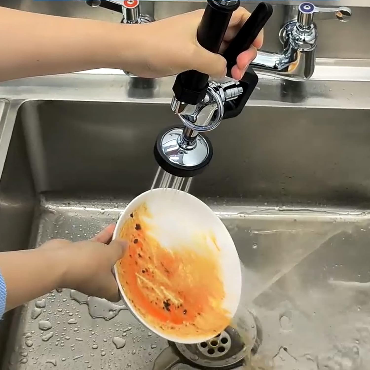 • 【1.42 GPM High Press Of Spray Valve 】Restaurant faucet with upgrade "No Screw" design spray valve,100% straight powerful jet spray, avoiding latent leakage problem caused by corroded screw,1.42GPM water flow ,rinse off any debris in second. Zinc alloy ring to hold the handle, free your hand.