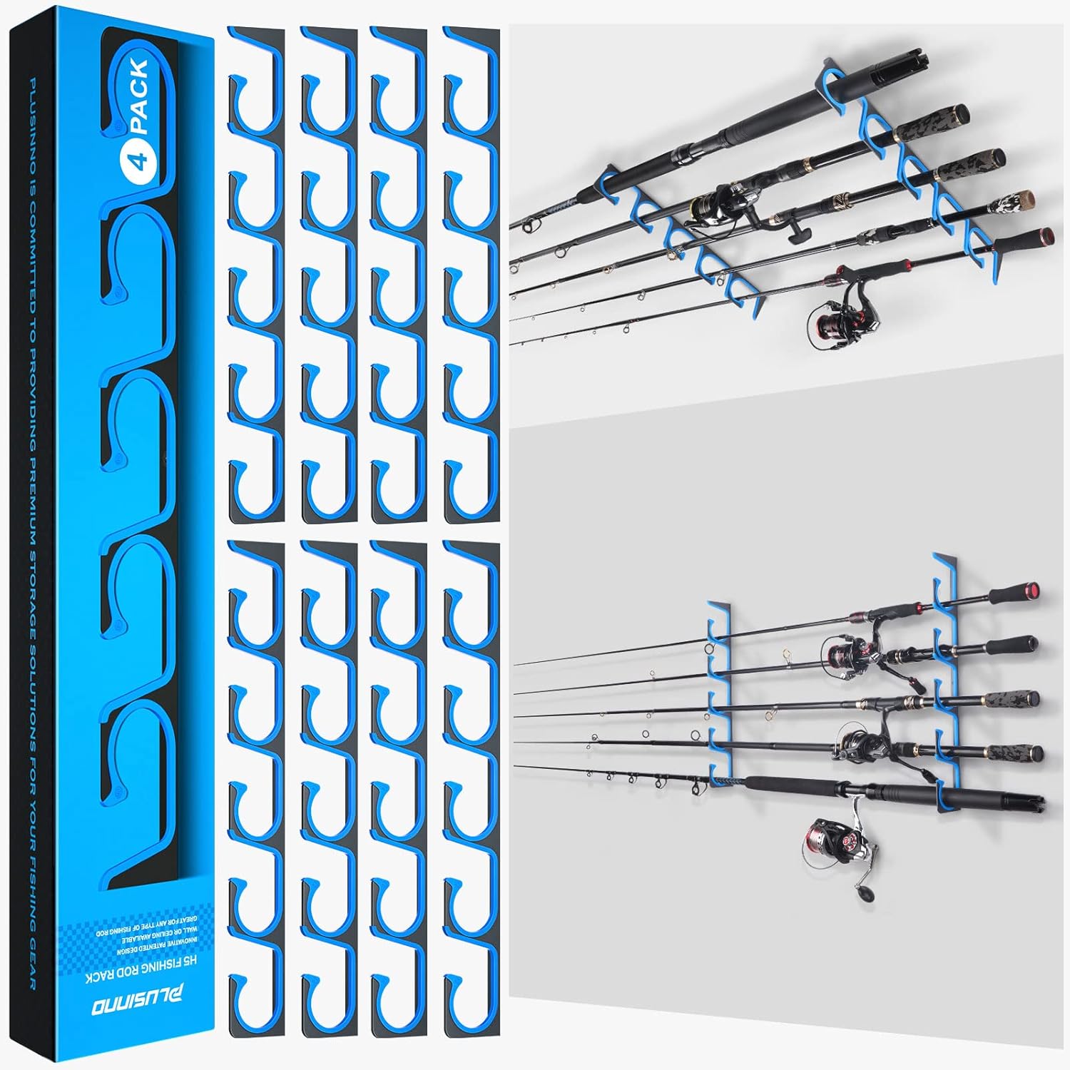 - KEY FEATURES FISHING ROD HOLDERS- PLUSINNO H5 Innovative fishing pole holders address anglers' most significant concerns - safe, organized, handy, damage-free storage of fishing rods! It Injects Protective Pad in the contact surface to prevent damage to your favorite rod! The thickened design increases the force-bearing area of the rod and rack, with no worry about indentation after long-term storage. You can easily store rods of any length or diameter out of the way for walls or ceilings!