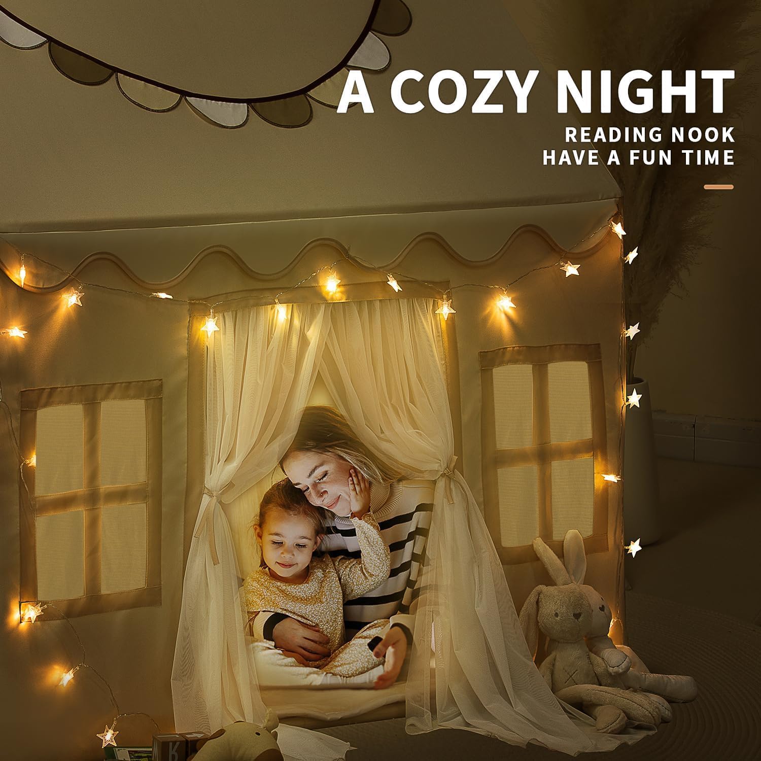 - Star Lights: Designed as a decoration, this play tent for toddlers features a string of star lights. Like a fairy tale castle sparkling at night, the twinkling stars create a lovely atmosphere. Batteries are not included in the product