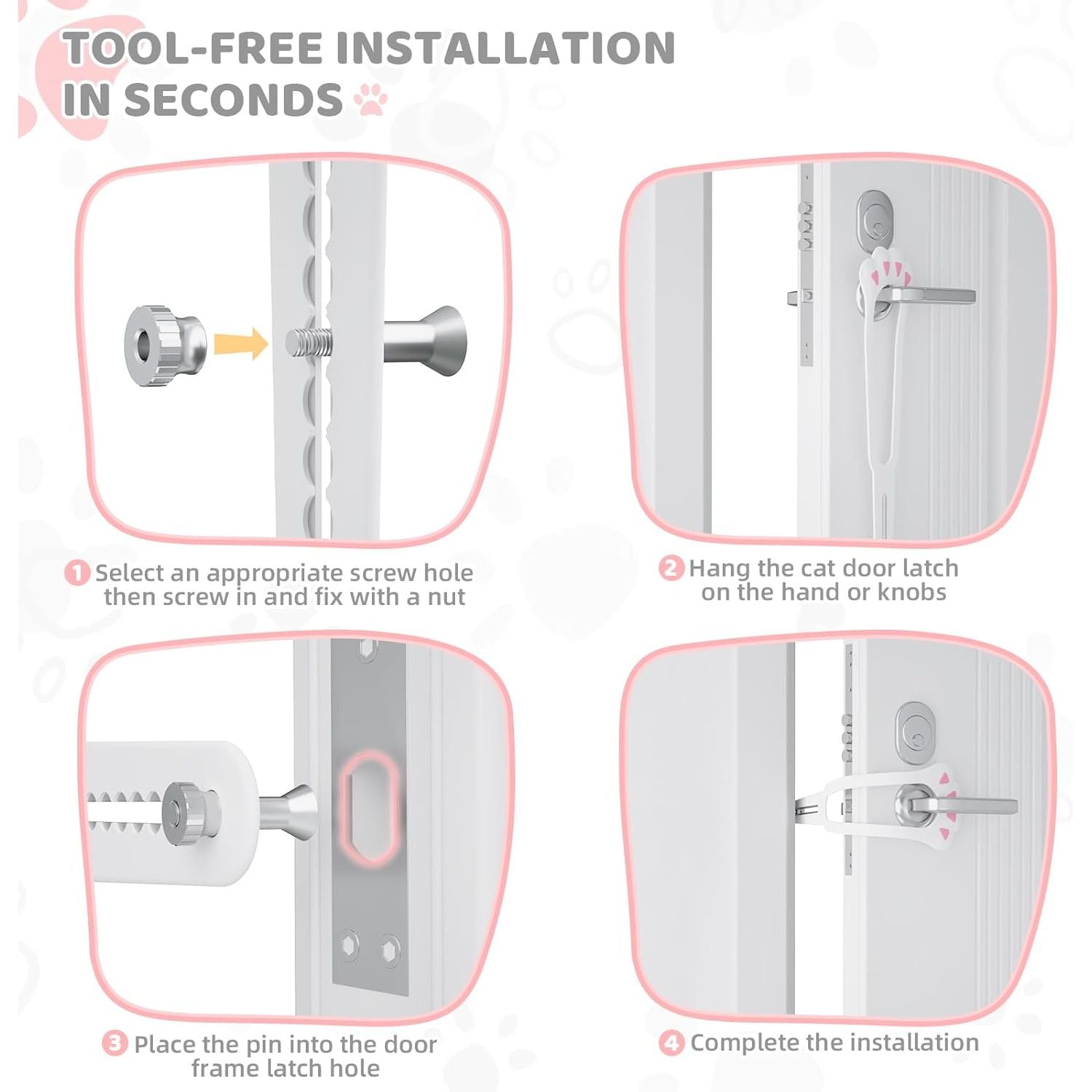 - Tool-free and Damage-Free Installation: Compared to other cat door stoppers on the market that either need to drill holes in doors or use sticky adhesive tapes that may ruin paint or leave ugly residue, our door latch for cats is super easy to install in seconds with no damage at all. Simply hang the cat door holder on the door lever, then insert the screw into the door frame latch hole. Done! You can effortlessly lock and unlock the door with one hand to freely let you in and out of the room.
