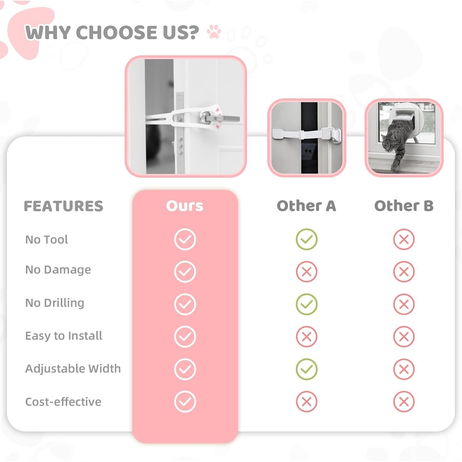 - Affordable Cat Door Holder Latch with Wide Application: By using this simple yet ingenious cat latch for doors, you can prevent large dogs and crawling babies away from the litter box or entering into certain rooms. Such as the kitchen, bedroom, den, bathroom, storage, laundry room, and other places. Rather than buying a cat interior door or pet gate , it is an economical way to create a private place for your cat and ease your own worries, perfect for pet lovers households with dogs and cats.