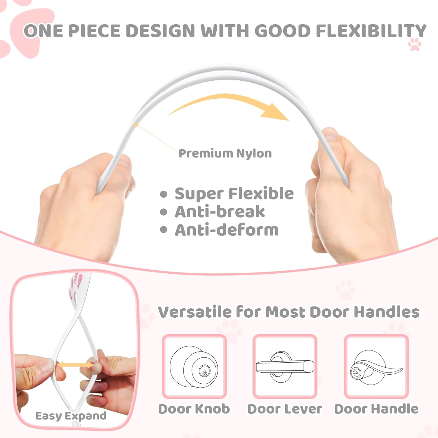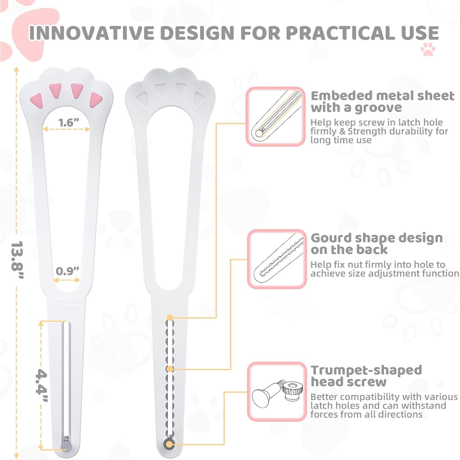 - Innovative Design Enhances Durability: Designed with an embedded metal sheet with a groove in the adjustable area, this cat door latch can be adjusted by sliding the trumpet shaped head screw left and right. The gourd shape design on the back helps firmly fasten the screw, making the cat door stopper extremely strong enough to withstand the dashes of large dogs. No worries about the screw popping out. Moreover, made of flexible nylon, it is compatible with various door knobs, handles and levers.