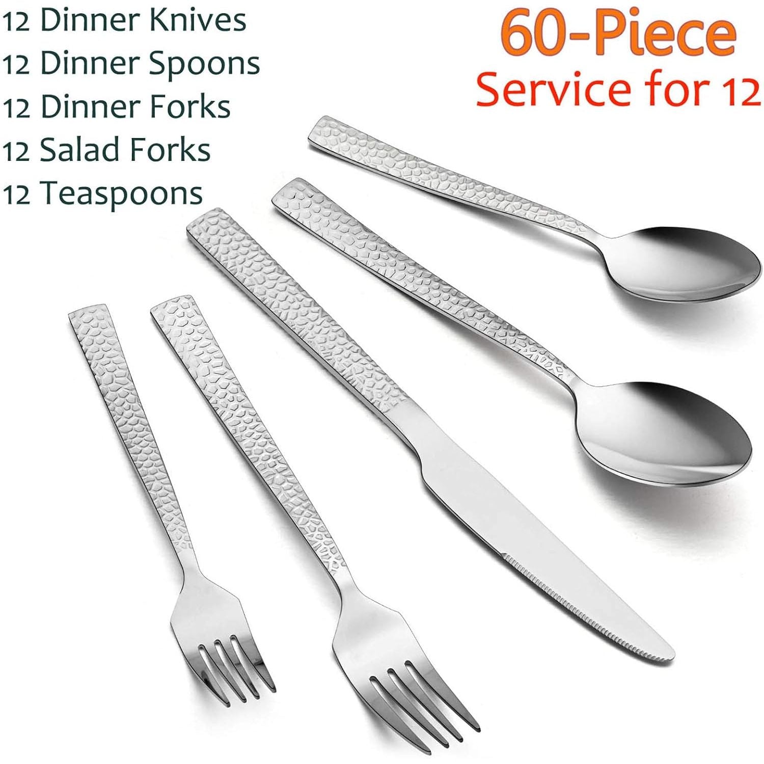 - 12 PLACE SETTINGS - E-far 60pcs stainless steel silverware set comes with 12 of each: Dinner Fork, Dinner Spoon, Dinner Knife, Teaspoon and Salad Fork, Dishwasher safe eating utensils
