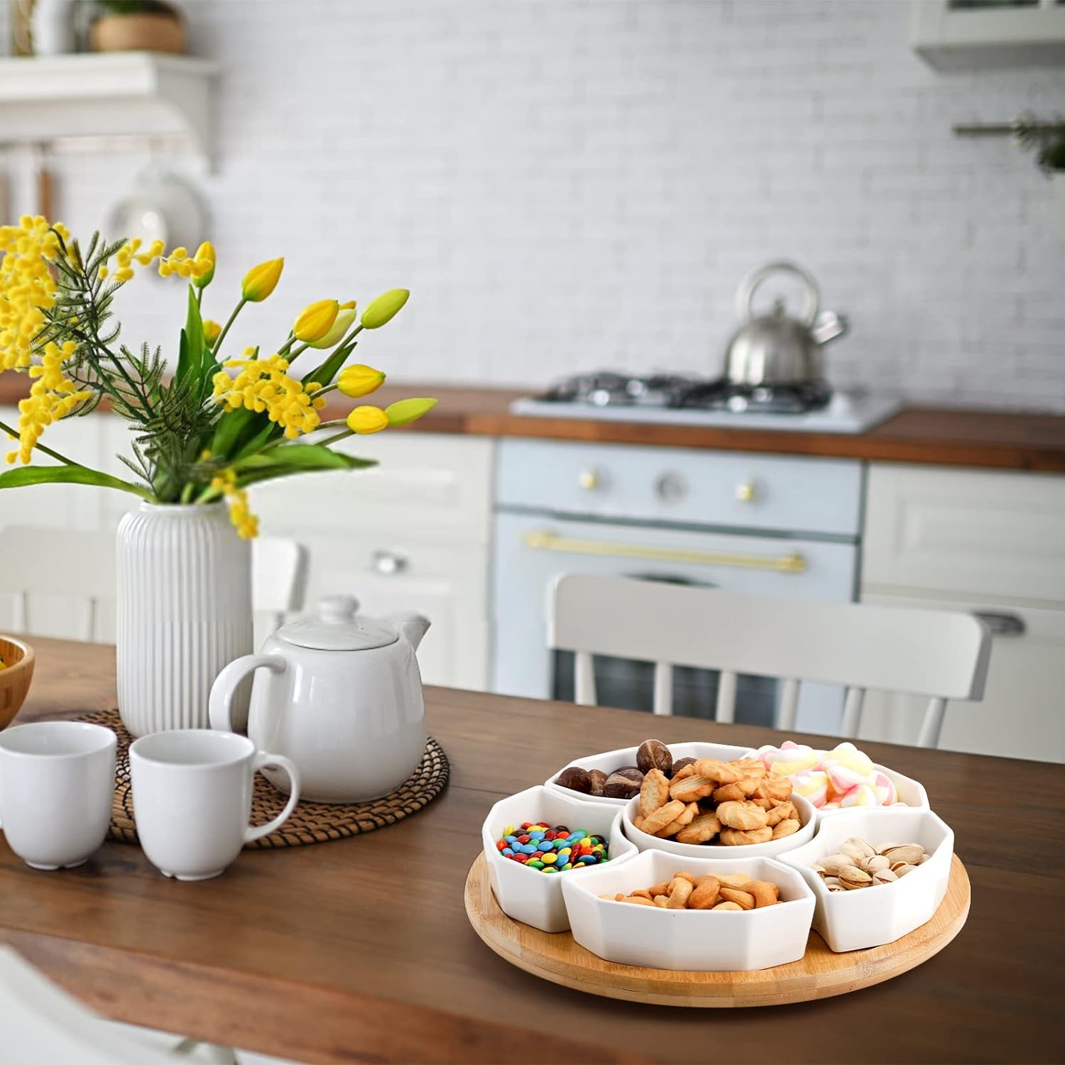 - High Quality Material: SOUJOY Platter is made of durable porcelain, lead-free, sturdy, safe for dishwasher, microwave, and freeze. And the turntable tray is made of natural bamboo and have a solid structure. Hand wash recommended and dry completely