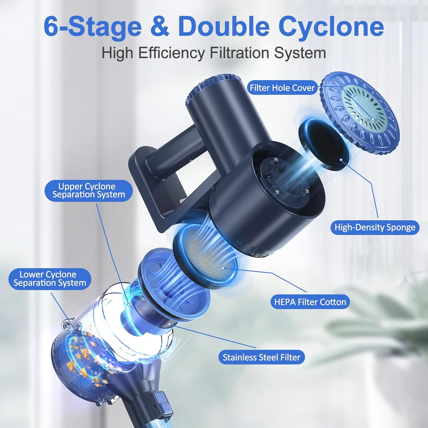 - 💡[6-STAGE HEPA FILTRATION SYSTEM]:Cordless vaccum hold breakthrough 6-Stage Double-Cyclone filtration system ensures that 99.98% of microscopic dust particles as small as 0.1 microns are filtered out, Upgrade refiltration system to avoid secondary pollution during cleaning and protect your family's health.