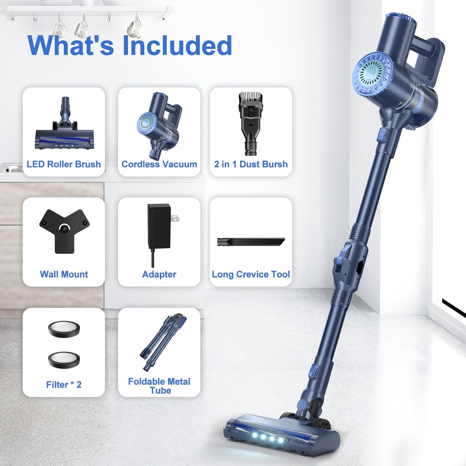 - 💡[POWERFUL SUCTION]: Our Vacuum cleaners cordless hlod 25000Pa powerful suction and 2 speed levels for deep cleaning on carpets, hardwood floors, etc. Upgraded vacuum floor brush effectively removes dirt and hair hidden in the carpet without tangling.