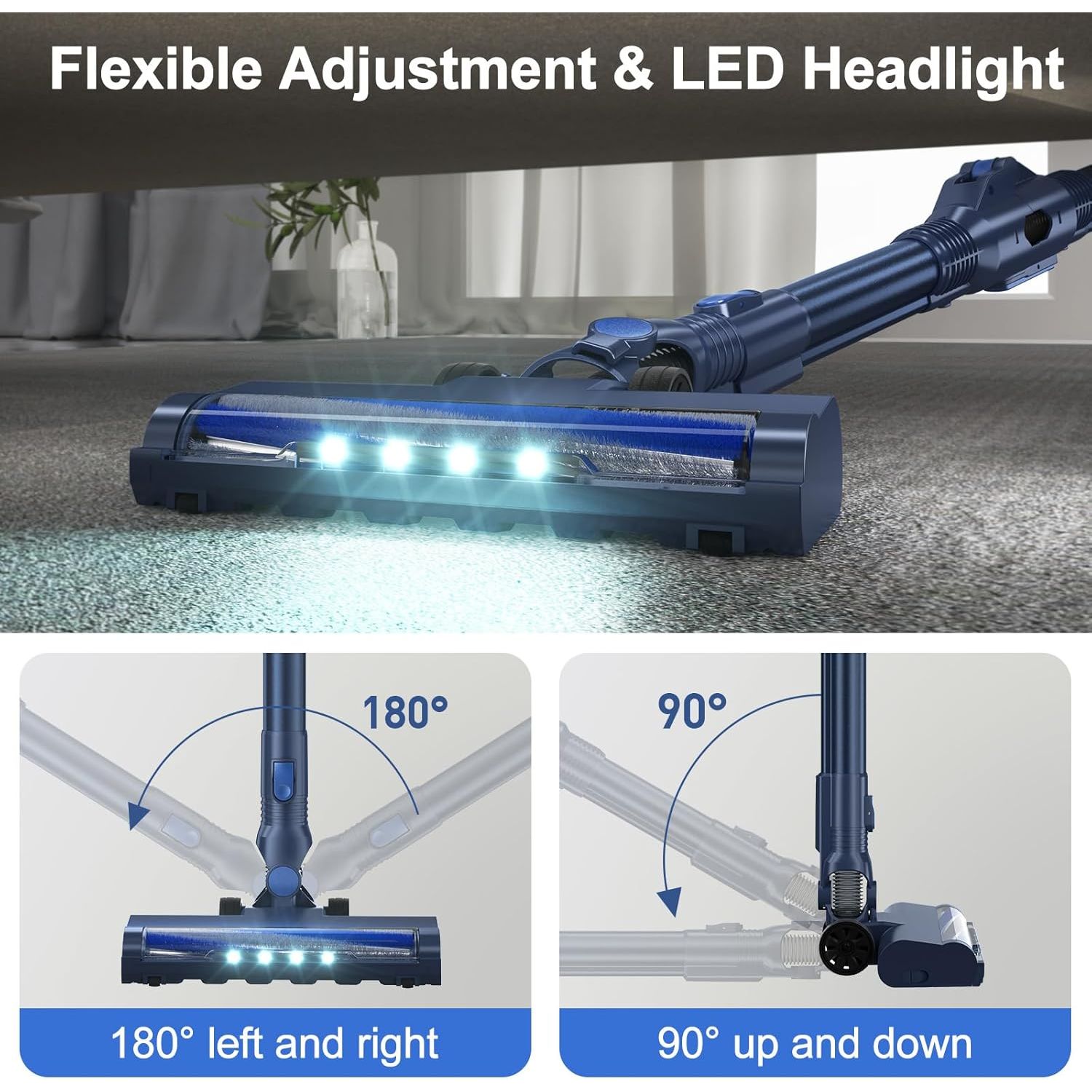 - 💡[LARGE-CAPACITY BATTERY] W400 stick vacuum built in 6 *high-capacity battery and lightning fast charging supports super long running time to meet your daily cleaning needs. Otherwise,The vacuum cleaner’s brushless motor generates less noise under 63dB. Also comes with LED headlights effectively clean particles and dust in dark places which provide a deeper cleaning.