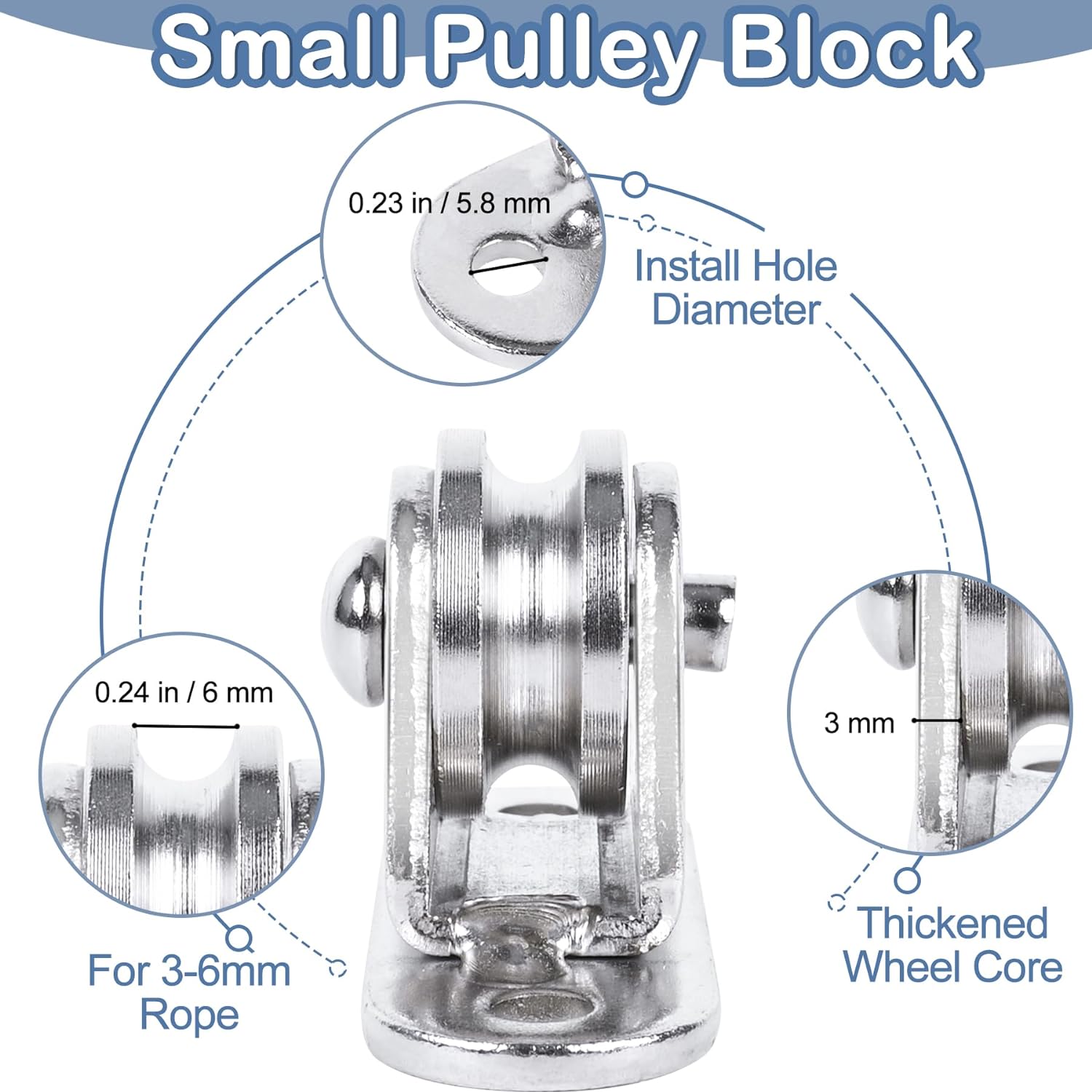 【Specifications & Weight Capacity】 Pulley Total Height: 3.4 cm/1.3 inch; Pulley Total Width: 6.1 cm/2.4 inch. Sheave Diameter: 2.5 cm/1.0 inch; Maximum rope diameter: 0.6 cm/0.236 inch; Weight Capacity: 176 lb. Screw Length: 3 cm/1.18 inch