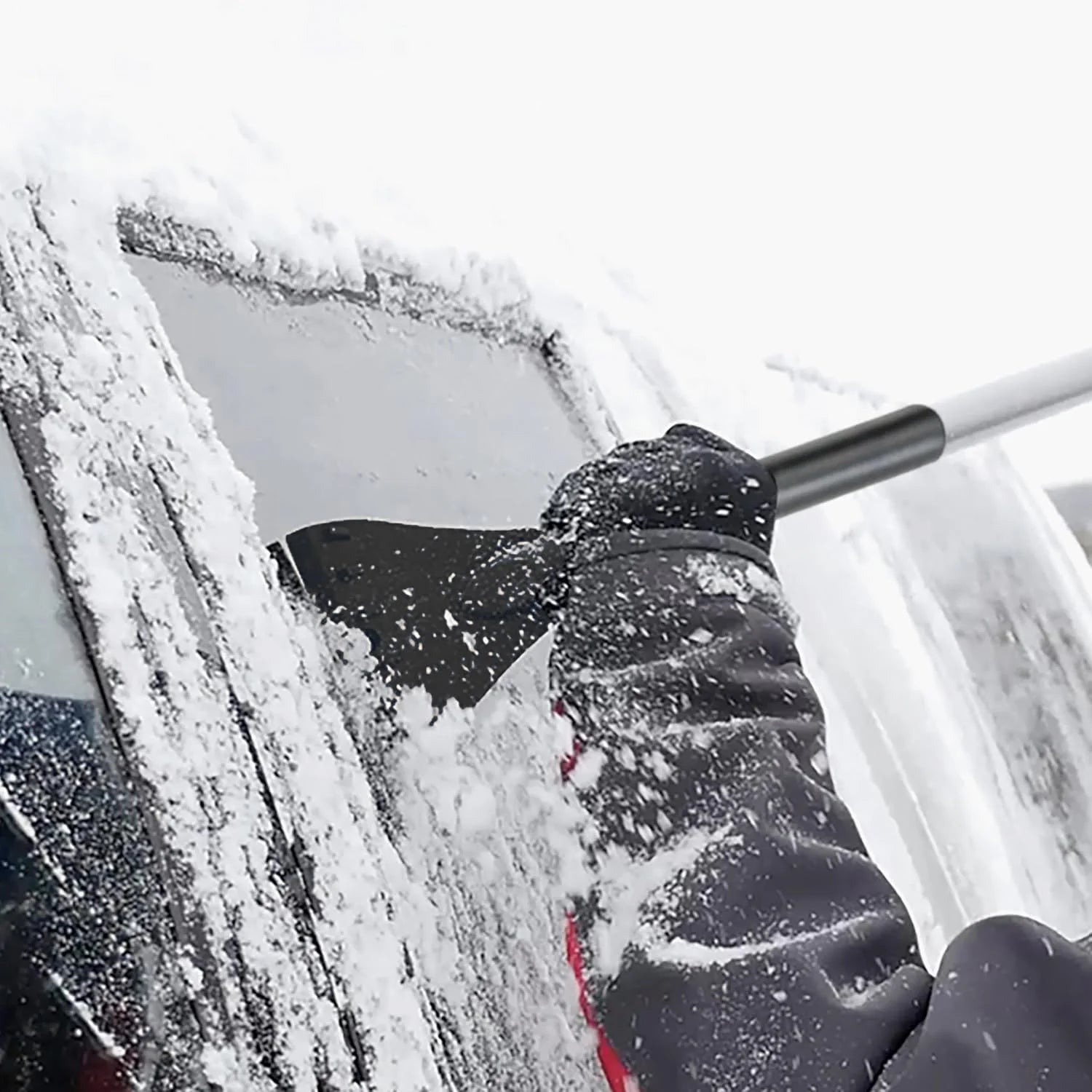 Telescoping pole adjusts from 30 to 49 inches to extend reach. Built-in ice scraper removes ice build-up on windshields.