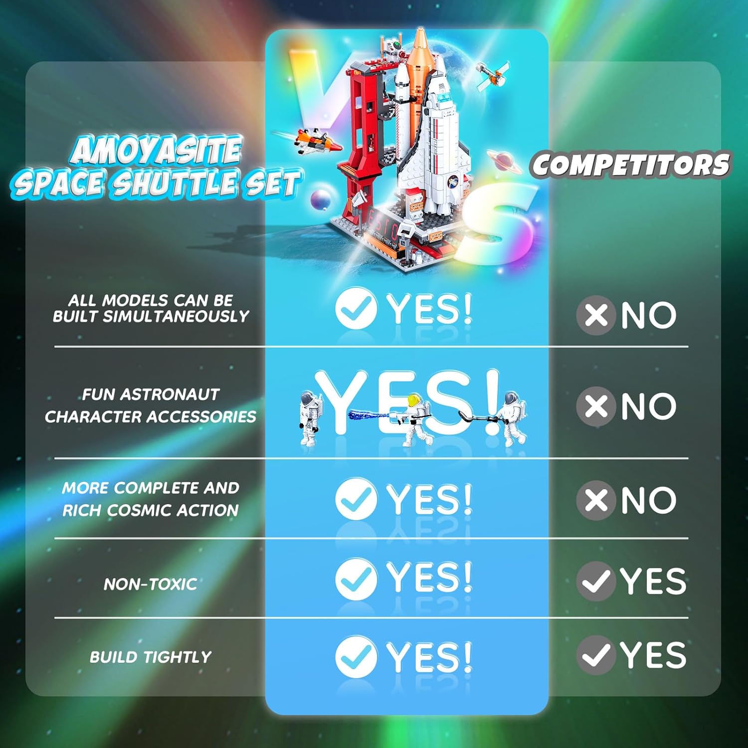 - SUPER COOL SPACE ADVENTURES SET: This action-packed Amoyasite Space Shuttle toy lets kids blast off into space to enjoy 12 different build-and-play experiences. Little builders can enjoy a fun and rewarding building task before they play out epic intergalactic stories. Kids take part in astronauts' interplanetary missions, and the toy figures can move its arms and legs for space action, simulate a flight in the toy Space Shuttle, complete a spacewalk & search the cosmos for new galaxies.