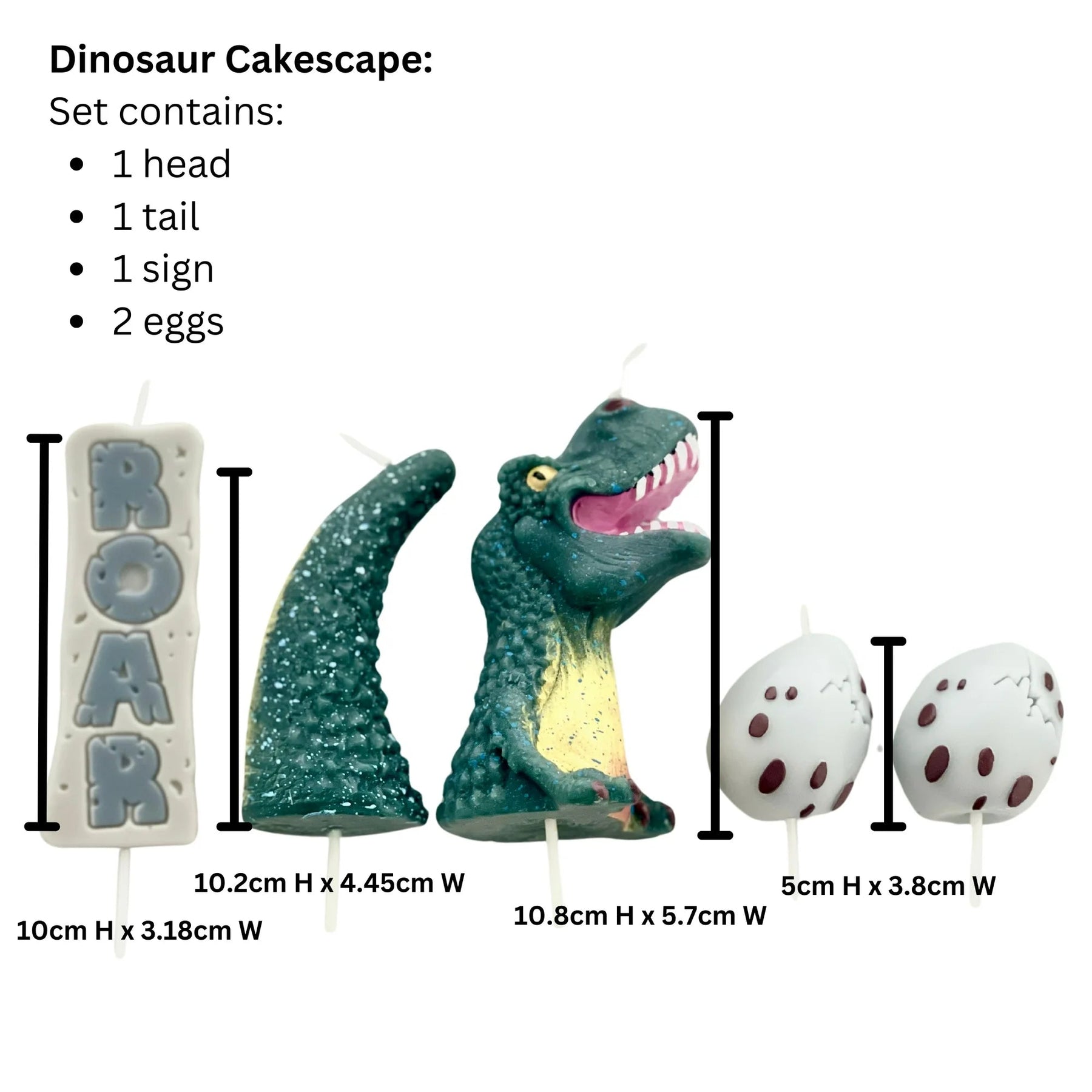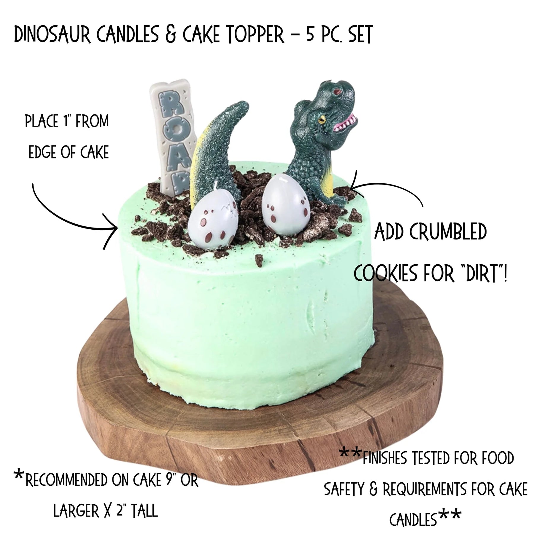 Fierce and fun dinosaur-themed candle set includes a dinosaur head, dinosaur tail, 2 dino eggs, and a bold "ROAR" sign to add an adventurous touch to any 9-inch or larger birthday cake.