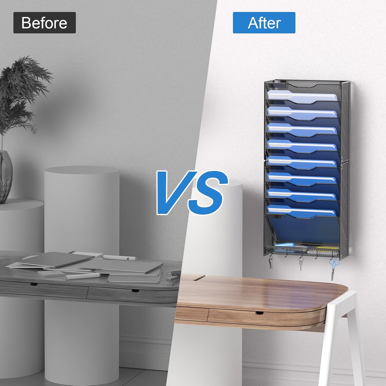 - [READY TO USE]: The file organizer is easy to use without complex assembling. This wall file holder with hooks can hang your keys and office supplies.
