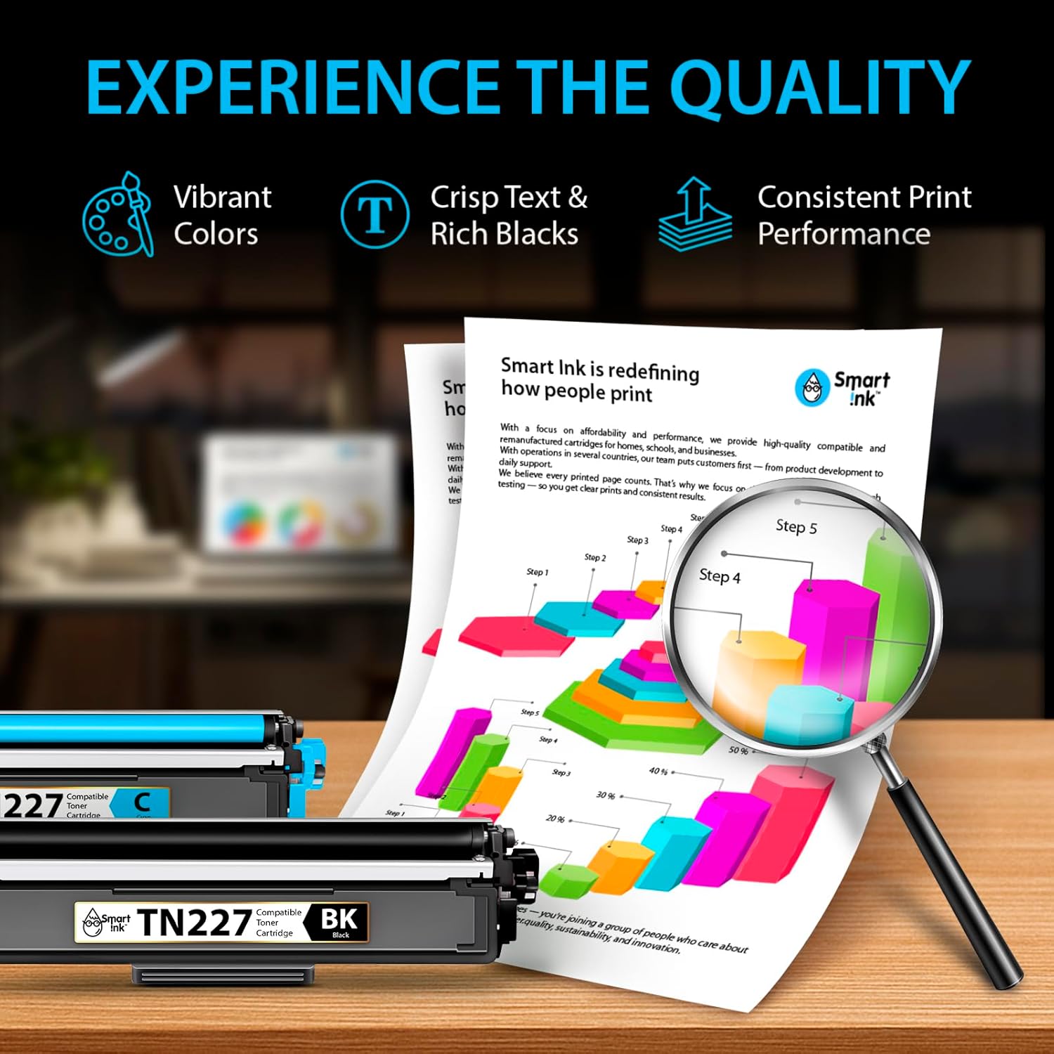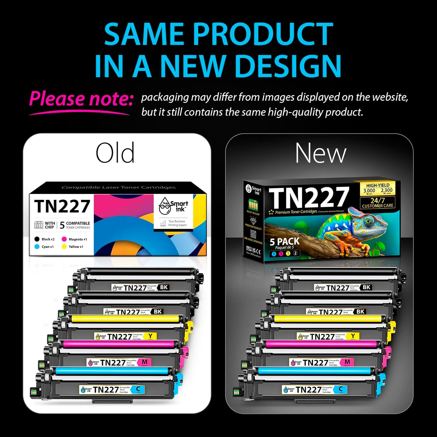 - Package Contents: 2 x Black TN227, 1 x Cyan TN227, 1 x Magenta TN227, 1 x Yellow TN227 (5 cartridges with chip in total)
