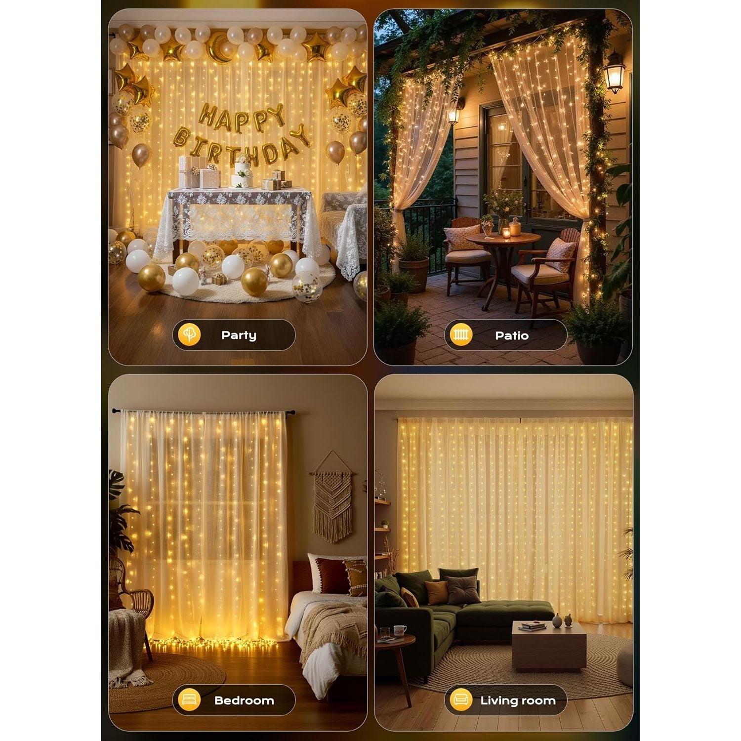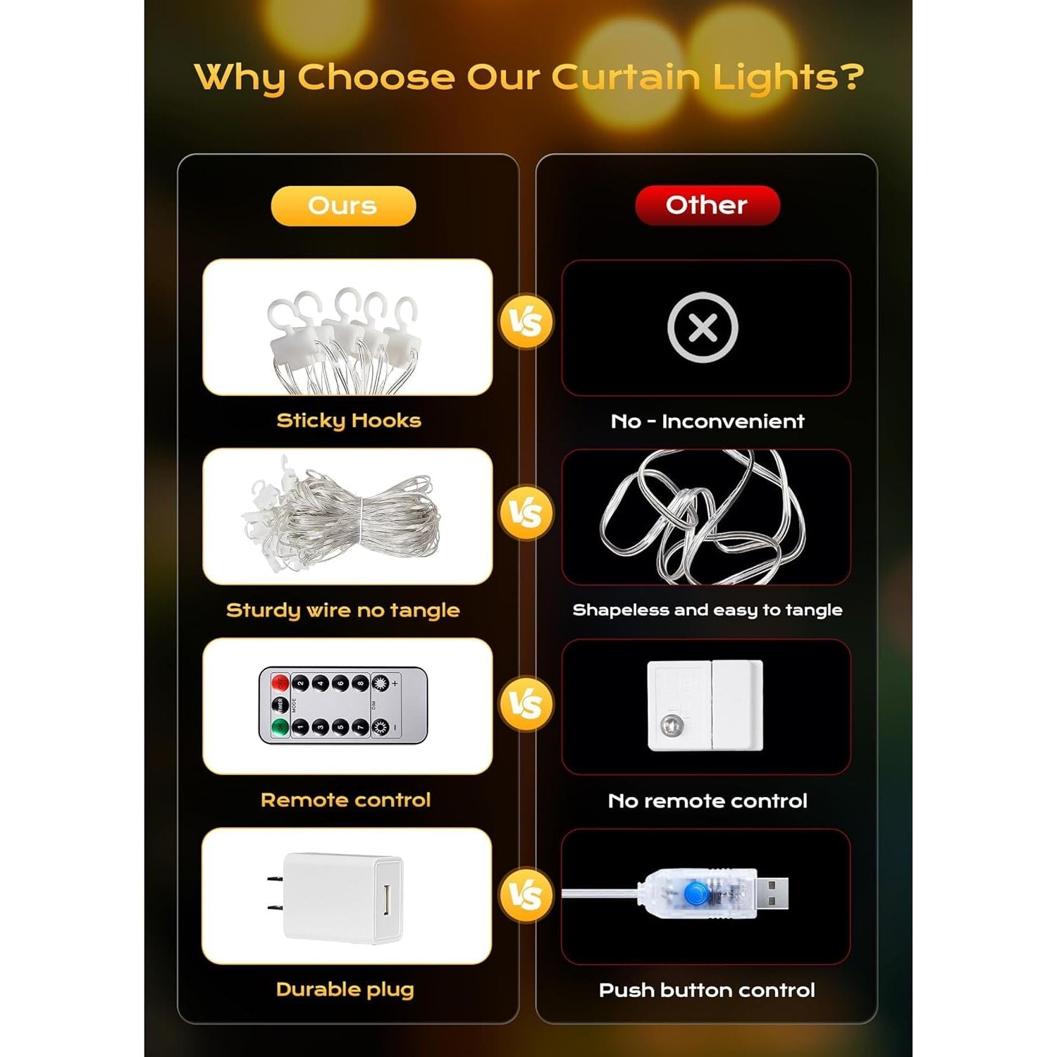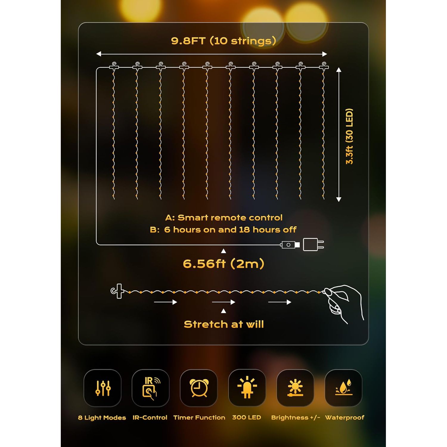 - ๐๐๐ ๐๐๐๐ฌ ๐๐ฎ๐ซ๐ญ๐๐ข๐ง ๐๐ญ๐ซ๐ข๐ง๐ ๐๐ข๐ ๐ก๐ญ๐ฌ: (Curtain is NOT included) (Hook size: 3.5cmร4cm) 300 individual LEDs, 9.8ft x 9.8ft Led Curtain Lights , made of copper wire, soft texture, can be cut freely without affecting the rest, so you can DIY any decoration you like.Copper wire drop strings is tough and flexible, hanging and adjustable desired height naturally easily; No limits to your imagination, Do the shape you like; Enjoy a fairytale world!