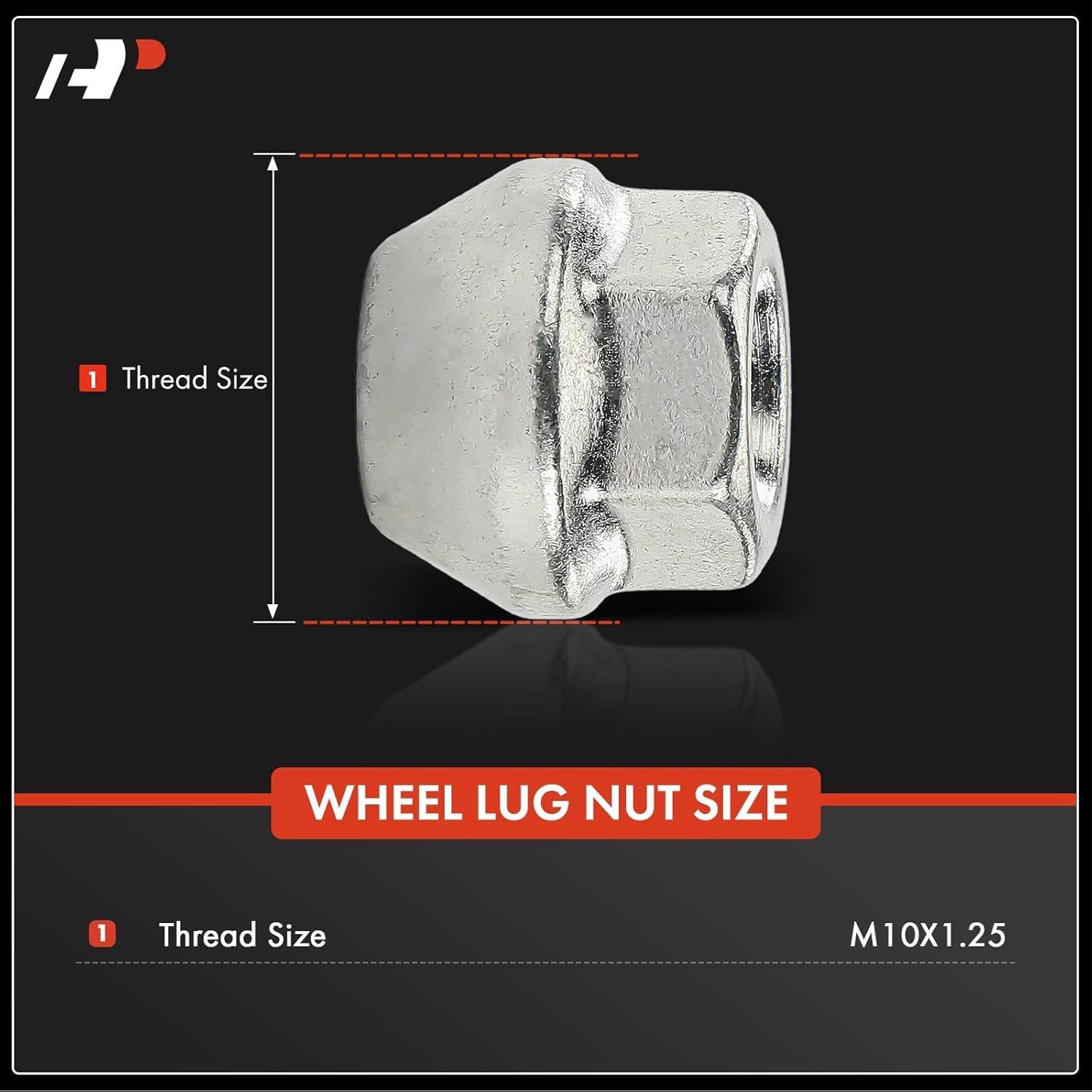• [Specifications]: ①Location: Front & Rear; ②Thread Size: M10x1.25;③Color: Galvanized; ④Shape: Tapered; ⑤Package Contents: 16 Nuts