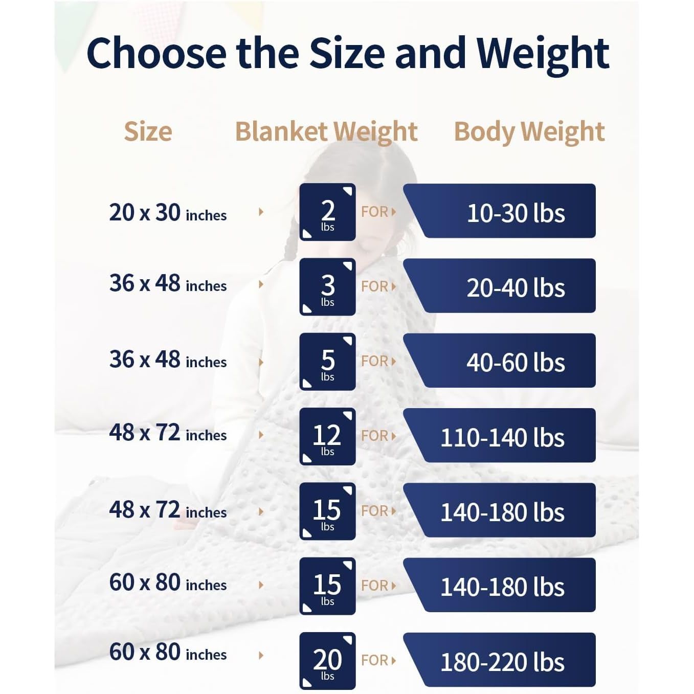- Choose the Right Size and Weight: We recommend a blanket that is about 10% of your body weight. Our carefully selected weights of 2 lbs, 3 lbs, 5 lbs and 7 lbs are suitable for different age groups of 30-40 lbs, 41-60 lbs and 61-85 lbs respectively. For taller , a larger 7lbs blanket is recommended