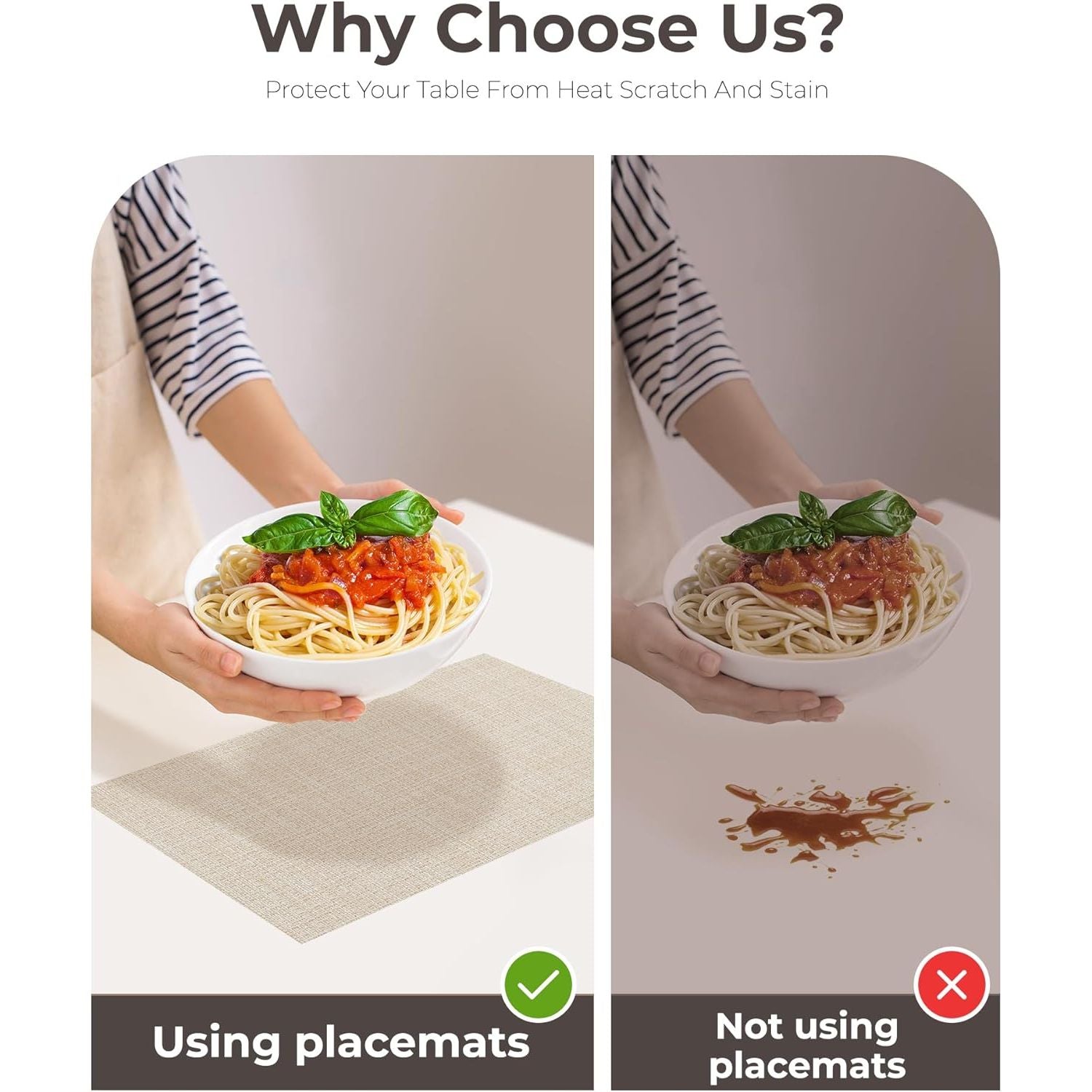 • Protects Your Table: Keep your table safe from scratches and spills with our heat-resistant placemats. They can withstand temperatures up to 176℉(80℃) and help keep food warm. Add style to your dining setting while ensuring table protection.